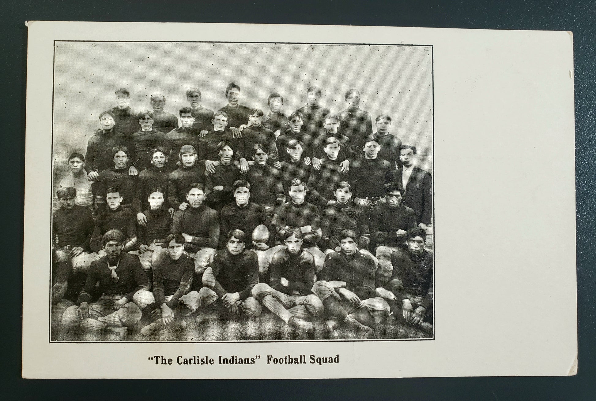 The 1906 Carlisle Indians football team, representing the Carlisle Indian Industrial School, had one of their most memorable seasons under legendary coach Glenn "Pop" Warner (his first season). The team finished with a record of 9-2 and was considered one of the strongest teams in the country that year.Key stars of the team included:Albert Exendine - A talented end who would later become a successful coachFrank Mount Pleasant - A versatile quarterback and exceptional athleteCharles Dillon - A powerful fullbackEmil Hauser - A standout tackleTheir most notable victories included wins over Pennsylvania (24-6) and Minnesota (17-0).They beat Albright College (82-0) and Susquehanna University (48-0).The two games they loss were to Penn State (4-0) and Harvard 5-0).Otherwise, they dominated their opponents.The team was known for their innovative play-calling and execution of the forward pass, which had just been legalized that season. Under Warner's guidance, Carlisle became one of the first teams to effectively utilize this new offensive weapon.Several of the players on this team ended up playing professional football in one form or another.Offered is an original REAL PHOTO POSTCARD of the 1906 Carlisle Indians football team (we've included a screenshot of the team from author, John S. Steckbeck's 1951 book,Fabulous Redmen - The Carlisle Indians and their Famous Football Teams.The book is the definitive history of the Carlisle football program.We'll include a copy of the book (rough shape) as a bonus.The postcard has some handwriting on the back and is in EX condition.This is the only example that we've ever seen.Historical early College Football piece.Dating one year before the arrival of Jim Thorpe on the Carlisle Indian School's campus.RARE!!!