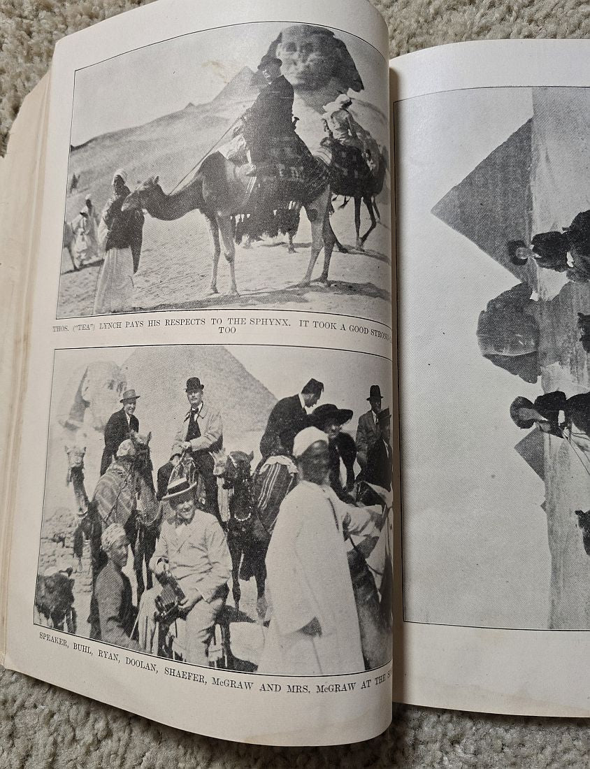This publication was issued to commemorate the Chicago White Sox /New York Giants World Tour of 1913-14. Published by S. Black Willsden & Co., Chicago, in 1914 immediately following the tour, the 128-page book features hundreds of photos as well as a day-by-day diary of the trip. Included among the images are full-page photos of Charles Comiskey (organizer of the tour and owner of the White Sox), John McGraw (manager of the Giants), and James Callahan (manager of the White Sox), as well as individual portrait images of all of the tour members including Jim Thorpe, Tris Speaker, Buck Weaver, Sam Crawford, Urban Faber, Hans Lobert, Fred Merkle, and Mike Donlin. These same players and many others are pictured countless times throughout the book, both on and off the field, in such faraway lands as Australia, Japan, Egypt, Italy, France, and England." General Condition:
