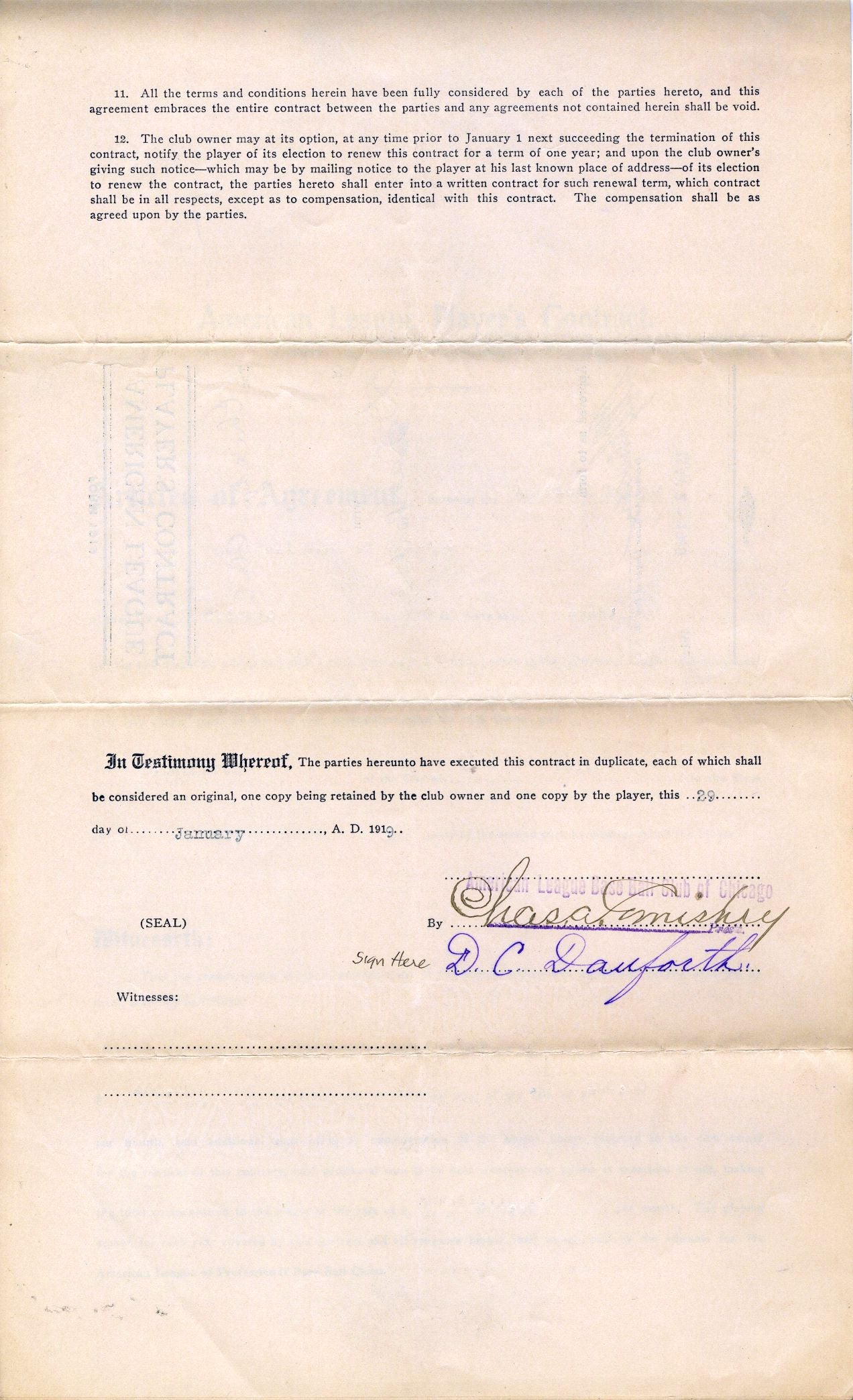 The 1919 Chicago White Sox season was their 19th season in the American League. They won 88 games to advance to the World Series but lost to the Cincinnati Reds. More significantly, some of the players were found to have taken money from gamblers in return for throwing the series. The "Black Sox Scandal" had permanent ramifications for baseball, including the establishment of the office of Commissioner of Baseball. Movies and books have been written about this dark chapter in baseball history.Like the notorious "Shoeless Joe" Jackson, pitcher Dave Danforth got his start with the Philadelphia Athletics before making his way to the Windy City. He would play Major League Baseball for 10 seasons (1911-12, 1916-1919, 1922-25). In addition to being a member of this notorious team, he also played on the 1917 World Series Championship White Sox team. After he retired from baseball he became a dentist.This 1919 contract represents Danforth's fourth and final season under the command of Hall of Fame owner Charles Comiskey, and each signals his consent to a $500/month salary with bold fountain pen signatures at the end of the document. A second Hall of Fame signature, that of American League president Ban Johnson, appears on the cover. Danforth would conclude his term of White Sox service with a 24-28 record and a 3.50 ERA.Full LOA from PSA/DNANOT FOR SALE