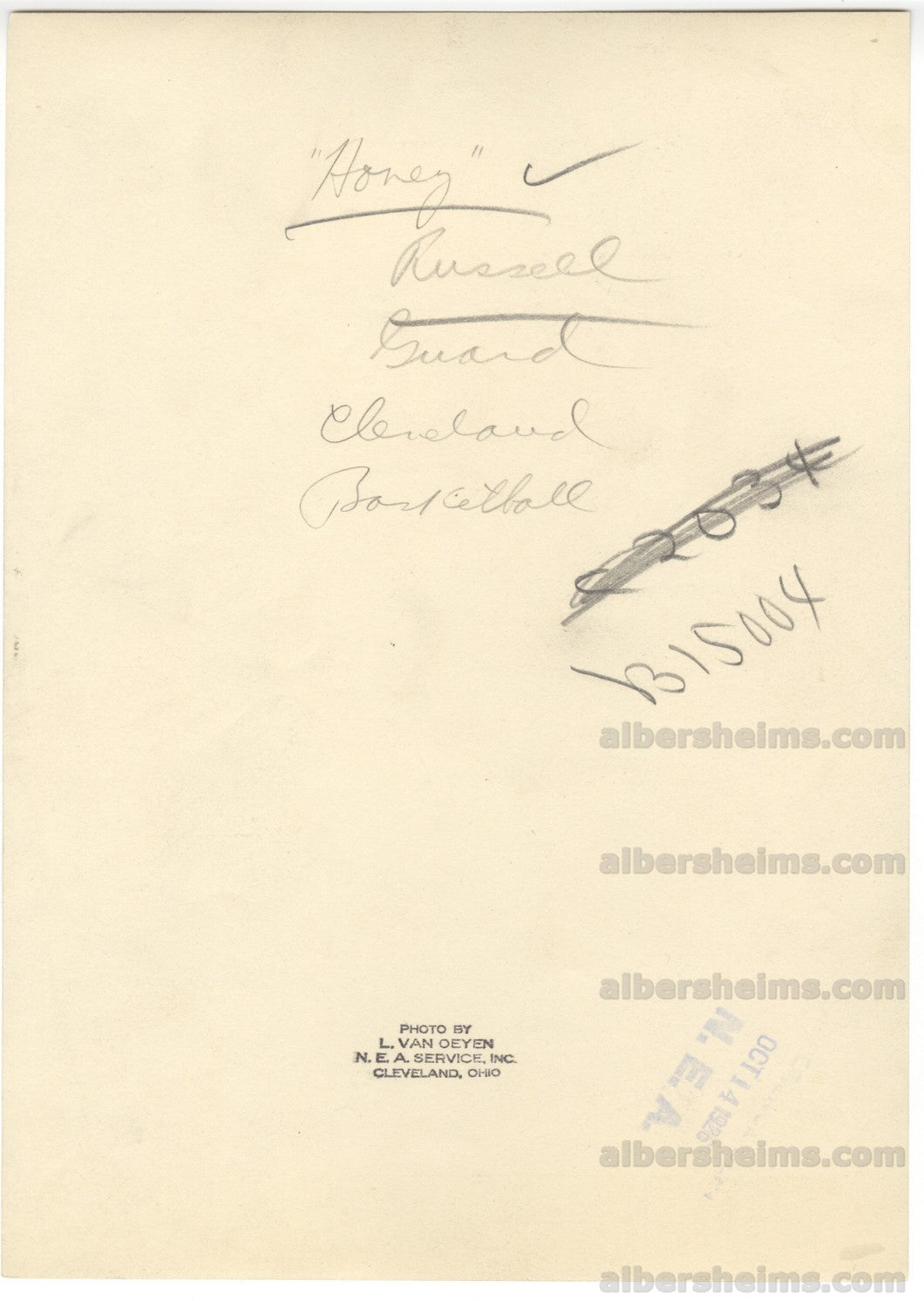 John Honey Russell(D. 1973) was an American basketball player and coach born in Brooklyn, New York. He turned professional after his sophomore year of high school, playing for numerous early 20th century pro teams, including many in the American Basketball League. His career included over 3,200 pro games (a number that would take a modern NBA player 30-40 years to equal). In addition, he coached and managed for over 30 years in all of the professional leagues in existence during his career. He was the first coach of the NBA's Boston Celtics (1946-1948). He also coached at Seton Hall University. In 1964, Russell was enshrined into the Naismith Memorial Basketball Hall of Fame.The Cleveland Rosenblums (also known as the Rosies) were an American basketball team based in Cleveland, Ohio that was one of the original members of the American Basketball League. The Rosenblums played in the league between 1925-1930, winning three championships before dropping out.In the inaugural 1925-1926 season of the American Professional Basketball League, the Rosenblums compiled a record of 23-7. Their leading scorers were John "Honey" Russell (216 points), Nat Hickey (198 points), and Carl Husta (158 points). On April 9, 1926, the Rosenblums won the ABL's first championship by defeating the Brooklyn Arcadians by a score of 23-22 in the final game of the league's first championship series played at Brooklyn's 71st Infantry Regiment Armory. The championship was decided in a best-of-five series, and the Rosenblums won in three consecutive games. The Rosenblums won the first and second games at Cleveland's Public Hall by scores of 36-33 and 37-21.Historic Original 1926 TYPE 1 photograph (measuring 6.75" x 9.75") of Honey Russell. The offered image was also taken by the greatest Sports Photographer of the era, Louis Van Oeyen. Condition is beautiful and there is a bold Van Oeyen stamp on the back!PSA/DNA LOA for the TYPE 1 photo