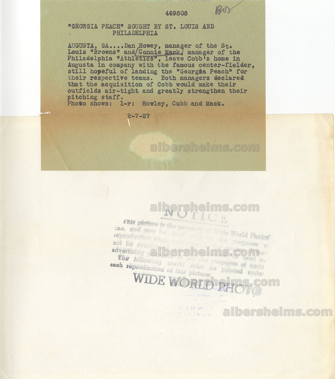 On November 2, 1926 - The Detroit Tigers release Ty Cobb. The release ends his 22-year association with the team. The Georgia Peach, was Detroit's player-manager for the past six seasons, he compiled a 479-444 (.509) winning record. Despite the winning record the club never finished closer than 16 games from first place. Mainly because the New York Yankees were dominating the American League.A few weeks later, the reason for his release and announced retirement the next day was made public. Former Detroit pitcher Hubert "Dutch" Leonard claimed that he, Cobb, Tris Speaker, and Cleveland outfielder Joe Wood had fixed a game between Detroit and Cleveland on September 25, 1919.On January 27, 1927, Commissioner Landis ruled that Cobb and Speaker were not guilty. He stated "These players have not been, nor are they now, found guilty of fixing a ball game. By no decent system of justice could such finding be made."Once Ty Cobb was cleared by Major League Baseball, a bidding war broke out between several teams. The two top suitors were the St. Louis Browns and the Philadelphia Athletics.The Athletics won out and signed both Cobb and Speaker.Offered is an original TYPE II Wide World Photos (stamped on back) of Cobb posed with Dan Howley, the manager of the Browns and Connie Mack with the original paper caption attached, dated 2/7/1927. Photo measures 7x9.Based on the stampings this was most likely printed in the 1940's using the original negative.Historically speaking, the Browns never had a shot!