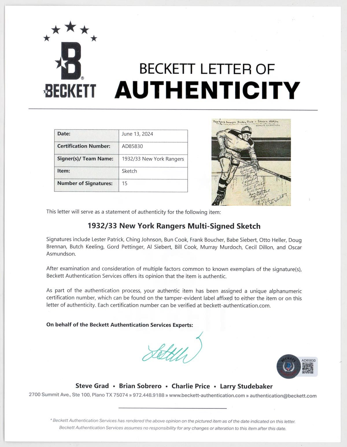 The1932-33 New York Rangers seasonmarked a triumphant campaign for the franchise's seventh year. The Rangers dominated the regular season with a solid 23-17-8 record, earning third place in the competitive American Division and securing their playoff berth.New York's playoff run was nothing short of spectacular. The Rangers dismantled the Montreal Canadiens 8-5 in a high-scoring quarter-final battle, then overwhelmed the Detroit Red Wings 6-3 in the semi-finals to punch their ticket to the Stanley Cup Finals for the fourth time in franchise history.In the championship series, the Rangers faced the formidable Toronto Maple Leafs and delivered when it mattered most. New York captured the Stanley Cup with a decisive 3-games-to-1 series victory, bringing home the second Stanley Cup championship in Rangers history and cementing their place among hockey's elite franchises. The season represented the perfect blend of regular season consistency and playoff excellence.Offered is an original pen and ink drawing by Sheldon Carpenter (American, 1918-1999). This is a loose, unframed artist's album page with signatures and drawings on both sides.1932-33 New York Rangers Multi-Signed Pen & Ink Drawing (all signatures in pen). This is not the 1933/34 team as noted along top having Gordon Pettinger. This is corroborated by Beckett Authentication Services.On the reverse is a pencil signed pencil drawing of the 1935 Oregon State University basketball team. The sheets are mounted to the loose album page and measure 9 x 8.5 inches and 8.75 x 6.5 inches image size and 10.875 x 8.375 inches sheet size. Signatures are a nice EX-MT/NM having been closed up in an album page all these years15 Autographs include:Albert "Babe" Siebertwas a dominant NHL defenseman and left winger who played from 1925-1939. Standing 6'2" and weighing over 200 pounds, he was known for his physical play, booming shot, and leadership abilities. Siebert won Stanley Cups with the Montreal Maroons (1926, 1935) and later captained the Montreal Canadiens. He won the Hart Trophy as NHL MVP in 1937, unusual for a defenseman.Tragically, Siebert drowned in Lake Huron near Zurich, Ontario on August 25, 1939, at age 35. He had been swimming when he got into difficulty and went under. His body was recovered the next day. The sudden death shocked the hockey world, cutting short the career of one of the era's most respected players. He was posthumously inducted into the Hockey Hall of Fame in 1964.Les Patrick(d.1960, HOF 1947) was a defenseman who played in the NHL during the 1920s-30s, primarily with the New York Rangers under his father Lester Patrick's coaching. Son of the legendary hockey patriarch, Les was a solid but not spectacular player who contributed to the Rangers' early years in New York.Bill Cook(d.1986, HOF 1952) was a Hockey Hall of Fame right winger who played for the New York Rangers from 1926-1937. The Rangers' first captain and franchise cornerstone, he led them to Stanley Cup victories in 1928 and 1933. Cook was the NHL's first 30-goal scorer and formed a dominant line with brother Bun Cook and Frank Boucher.Frank Boucher(D. 1977, HOF 1958) was a Hockey Hall of Fame center who played for the New York Rangers from 1926-1944. Known for his exceptional playmaking and sportsmanship, he won the Lady Byng Trophy seven times in eight years (1928-1935). Boucher centered the famous line with Bill and Bun Cook, helping the Rangers win Stanley Cups in 1928 and 1933.Ching Johnson(d.1979, HOF1958) was a Hockey Hall of Fame defenseman who played for the New York Rangers from 1926-1937. Known for his fierce physical play and booming body checks, the 5'11", 210-pound Johnson was one of the NHL's most intimidating defenders. He helped the Rangers win Stanley Cups in 1928 and 1933, forming a formidable defensive partnership with Taffy Abel.Earl Seibert(D. 1990,HOF 1963) was a Hockey Hall of Fame defenseman who played from 1931-1946, primarily with the New York Rangers, Chicago Blackhawks, and Detroit Red Wings. Son of Oliver Seibert, he won Stanley Cups with Chicago (1938) and Detroit (1943). Known for his smooth skating and two-way play, Seibert was selected to multiple All-Star teams and was considered one of the era's premier defensemen.Bun Cook(D. 1988, HOF 1995) was a Hockey Hall of Fame left winger who played for the New York Rangers from 1926-1936. Brother of Bill Cook, he formed the legendary "Bread Line" with Bill and Frank Boucher. Known for his speed and scoring ability, Bun helped the Rangers win Stanley Cups in 1928 and 1933. He was a consistent offensive threat throughout his career.Additional autographs include:Ott Heller(D. 1980) played frm 1929-56 all for the NY RangersDoug Brennan(D. 1972) 1925-36 all for the NY RangersButch Keeling(D. 1984) played for Toronto St. Patricks, Maple Leafs, and Rangers from 1925-40Gord Pettinger(D. 1986) 1930-46 Rangers, Detroit Red Wings, and Boston BruinsMurray Murdoch(D. 2001) played from 1925-38 for the NY RangersCecil Dillon(D. 1969) played in the NHL and AHL from 1930-42 for the Rangers & Red Wings.In the AHL - Indianapolis, Providence, and Pittsburgh HornetsOscar Asmundson(D. 1964 at age 55) played from 1928-45 for the Rangers, Red Wings, St. Louis Eagles, NY Americans, and Montreal CanadiensFull Beckett Authentication Services LOA (for the NY Rangers sheet)The bonus 1934-35 Oregon State Basketball Pacific Coast North Champions - Team Artist's sketch has been signed by 10 members of the team including:Slats Gill(D. 1966 - Head Coach)was a Basketball Hall of Fame coach who led Oregon State University from 1928-1964. Known for his innovative coaching methods and player development, Gill compiled a 599-392 record over 36 seasons. He guided the Beavers to two NCAA championships (1942, 1949) and multiple conference titles. Gill was renowned for his "iron man" approach, often playing his starters the entire game, and for developing the fast-break offense.Fred Hill (D. 2005), George Hibbard (D.) First