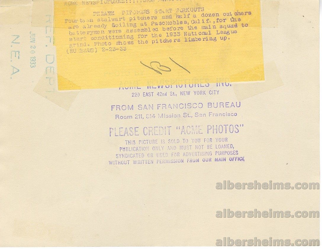 Offered is a 7" x 9" original TYPE 1 photo with the ACME Photos stamp on the back along with the original paper caption from February 22, 1933 of the Pittsburgh Pirates pitchers working out at Spring Training in Paso Robles, CA.Pitchers and catchers had just reported.Baseball Hall of Famer, Waite Hoyt can be seen the photo watching the younger players.