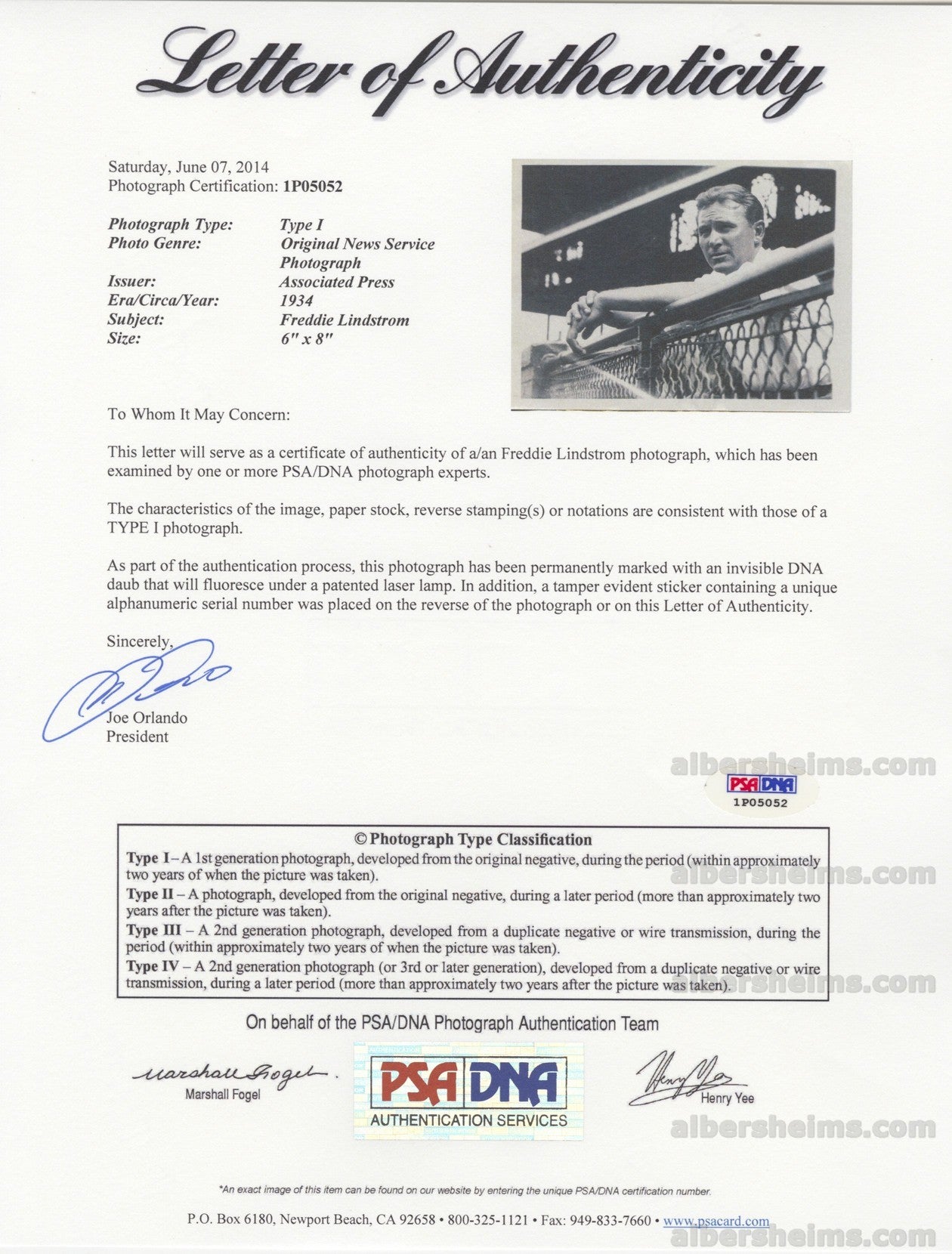 Freddie Lindstrom was a National League baseball player with the New York Giants, Pittsburgh Pirates, Chicago Cubs and Brooklyn Dodgers from 1924 until 1936. He was inducted into the Baseball Hall of Fame in 1976.Offered is a 6x 8 Associated Press photo with the stamp under the original paper caption. Lindstrom was sidelined by some injuries in 1934. He came back super strong in 1935, playing in the outfield between the Waner Brothers and finished second on the team with a.310 batting average (8th in the National League).PSA/DNA LOA for the TYPE 1 photo