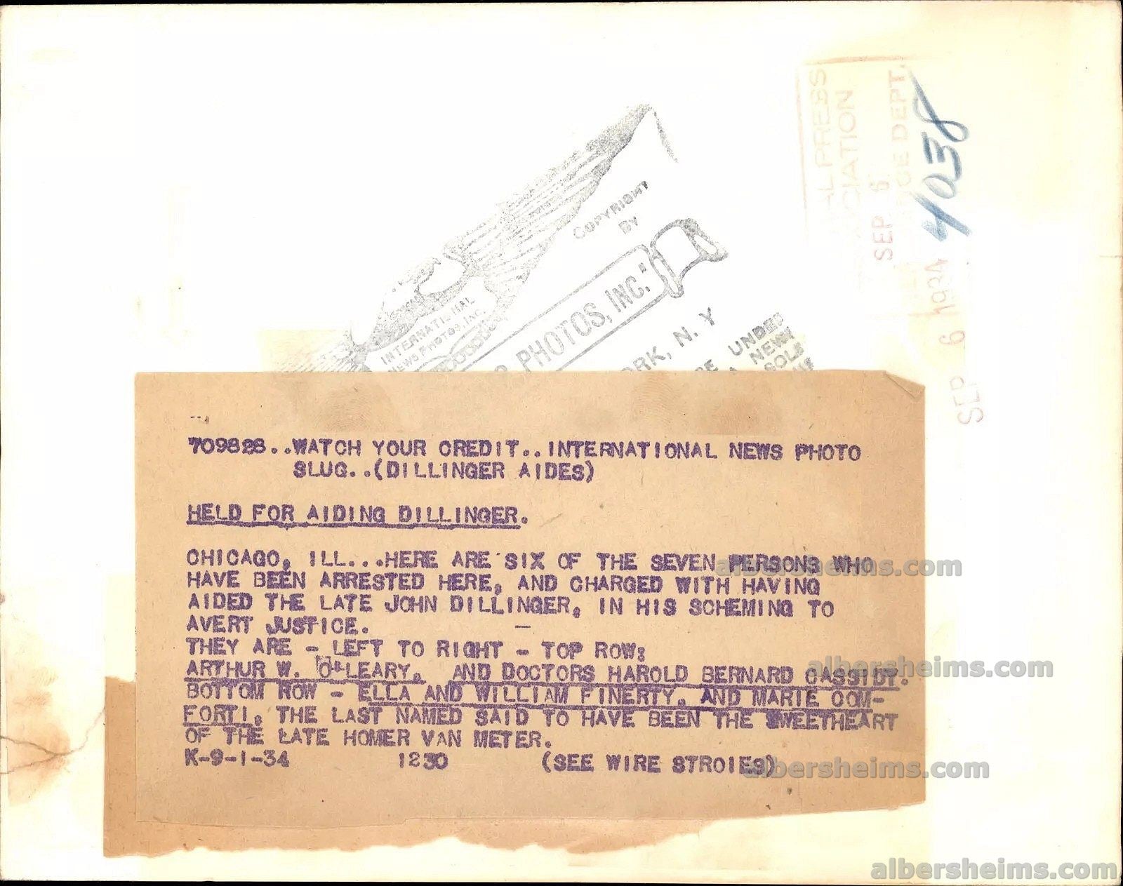 1934 GROUP of SEVEN Arrested for Aiding JOHN DILLINGER Original Press PhotoThis photo is dated September 1, 1934. This image shows six of the seven persons arrested and charged with having aided the late John Dillinger. They are - Arthur O'Leary (a private eye who worked for Dillinger's lawyer - they found a wooden gun from Dillinger in his apartment upon his death), Dr Harold Bernard Cassidy (the plastic surgeon who performed a facelift on Dillinger), Ella and William Finerty (whose home was used to perform the plastic surgery on Dillinger) and Marie Comforti, the last named said to have been the sweetheart of the late Homer Van Meter (who was shot and killed in St. Paul, MN when he was confronted by 4 police officers on August 23, 1934).Van Meter was a part of the Dillinger Gang as well as an associate of Baby Face Nelson.Photo measures 8.5 x 6.5 and is in EX condition.Original International News Photos stamp on the back along with original date stamp from 1934.