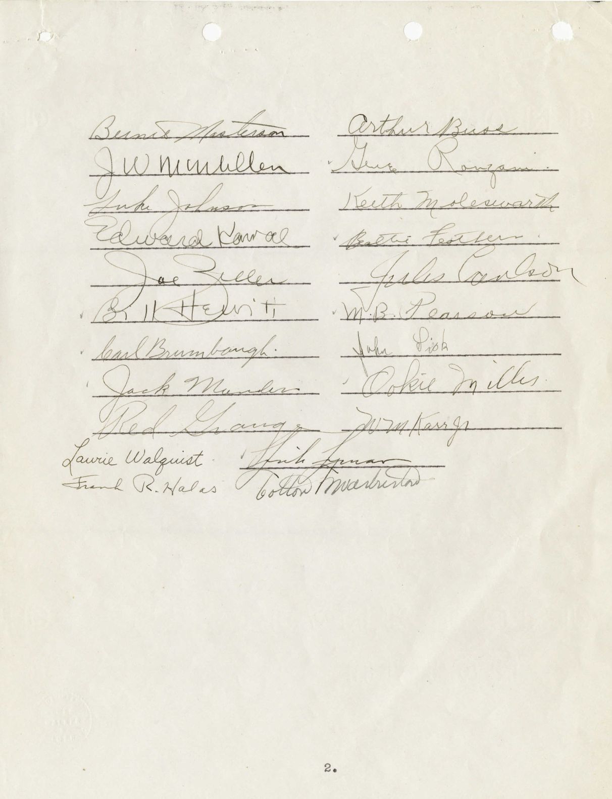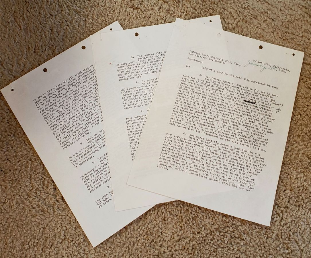 Offered is 6 page treasure trove that derives from the files of Metro-Goldwyn-Mayer, and was inked to secure the services of this early NFL powerhouse "...for use in connection with one short subject [film]..." Listed in the typed body copy, and then appearing in autograph form on the closing pages, are the names of twenty-three members of the Bears squad, most notably Hall of Famers Red Grange, George Halas (two signatures), Link Lyman and Bill Hewitt, along with stars Beattie Feathers and Bernie Masterson. All autographs rate an impressive 9/10, and the pages remain in splendid condition with torn punch holes at top and storage folds, neither of which cause any concern.Includes the very rare autograph of Pro Football Hall of Famer, Bill Hewitt (D. 1947) played five seasons for the Chicago Bears (1932-1936), three for the Philadelphia Eagles (1937-1939), and one for the Phil-Pitt Steagles (1943). He is probably most remembered for his refusal to wear a helmet. He attended the University of Michigan. Hewitt died in a car crash in 1947. Hewitt was inducted into the Pro Football Hall of Fame in 1971.Additional tough seldom found autographs on these documents include:Keith Molesworth (D. 1966 at the age of 60) played in the NFL (halfback/QB) for the Chicago Bears from 1931-37. He also played minor league baseball for 7 years while he was the T-formation QB for the Bears that featured a Red Grange and Bronko Nagurski backfield (the Bears were NFL champs in 1932 and 1933). He then went on to coach the backfield at the U.S. Naval Academy before becoming an assistant coach for the Pittsburgh Steelers in 1952. He was named head coach of the NFL's Baltimore Colts (first year in the NFL) in 1953, the first season of that franchise's existence. He remained with the club as a vice president and director of personnel until dying of a heart attack on March 12, 1966, while seeding his lawn, at the age of 60Cotton Warburton (D. 1982) was a star college QB with the U of Illinois and became a noted editor in Hollywood (including Mary Poppins). He was signed by the Bears in 1935, but never played a regular season game. He was elected to the College Football HOF in 1975.Laurie Walquist (D. 1985) was a professional American football player who played quarterback for nine seasons for the Chicago Bears. He was also the first-ever head coach for the Chicago Bruins of the American Basketball League. Walquist starred in basketball in 1919-20, 1920-21, 1921-22 and was picked as All-Conference guard in 1922. Additionally, he won four letters in football, was captain in 1921 and played right halfback and quarterback under Robert Zuppke. He was picked for All-Conference and All-Western in 1919 and 1920. Walquist played with the Chicago Bears for nine season (1922, 1924-1931) and continued with the team through the mid-1930s as an assistant coach along with Paddy Driscoll under head coach George Halas.Bert Pearson (D. 1945 age the age of 40) Pearson Played for the Bears and Chicago Cardinals from 1929-36 out of the Kansas State.Eddie Kawal (D. 1960 at the age 50) He played professionally as a Center in the National Football League (NFL) for the Chicago Bears and the Washington Redskins. He attended the University of Illinois and Pennsylvania Military CollegeCarl Brumbaugh (D. 1969) was an American college and professional football player who was a quarterback and halfback in the National Football League (NFL) for nine seasons in the 1930s. Brumbaugh played college football for Ohio State University and the University of Florida, and thereafter, he played professionally for the Chicago Bears, Cleveland Rams and Brooklyn Dodgers of the NFL. During his nine-year NFL career, he played for the Chicago Bears from 1930 to 1936, the Cleveland Rams in 1937, the Brooklyn Dodgers in 1937, and finished with the Bears in 1937 and 1938. Brumbaugh was a member of the legendary early 1930s Bears teams that included future hall of famers Red Grange and Bronko Nagurski, won the NFL Championships in 1932 and 1933, and played for a third in 1934.Auction LOA's from PSA/DNA. LOA from James Spence Authentication.