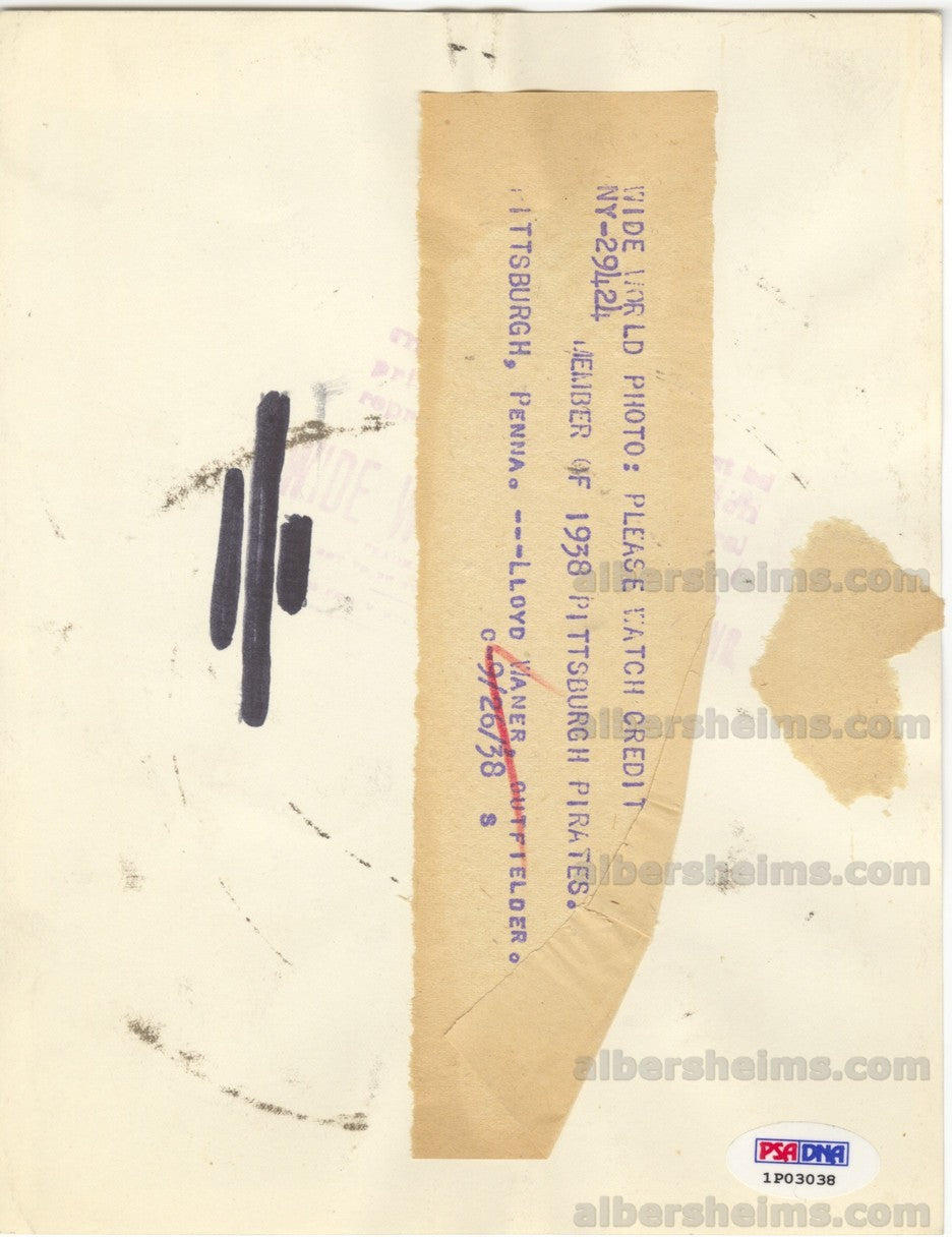 Lloyd Waner,nicknamed "Little Poison", was a Major League Baseball (MLB) center fielder. His small stature at 5 ft 9 in and 132 lb made him one of the smallest players of his era. Along with his brother, Paul Waner, he anchored the Pittsburgh Pirates outfield throughout the 1920s and 1930s. After brief stints with four other teams late in his career, Waner retired as a Pirate.Fantastic crystal clear shot of this futureThis 6" x8" Times Wide World photos has the original paper caption on the back as well as the original news service stamping.Caption dates this photo 9/26/38 from Pittsburgh.One his finest images!PSA/DNA LOA for the photo