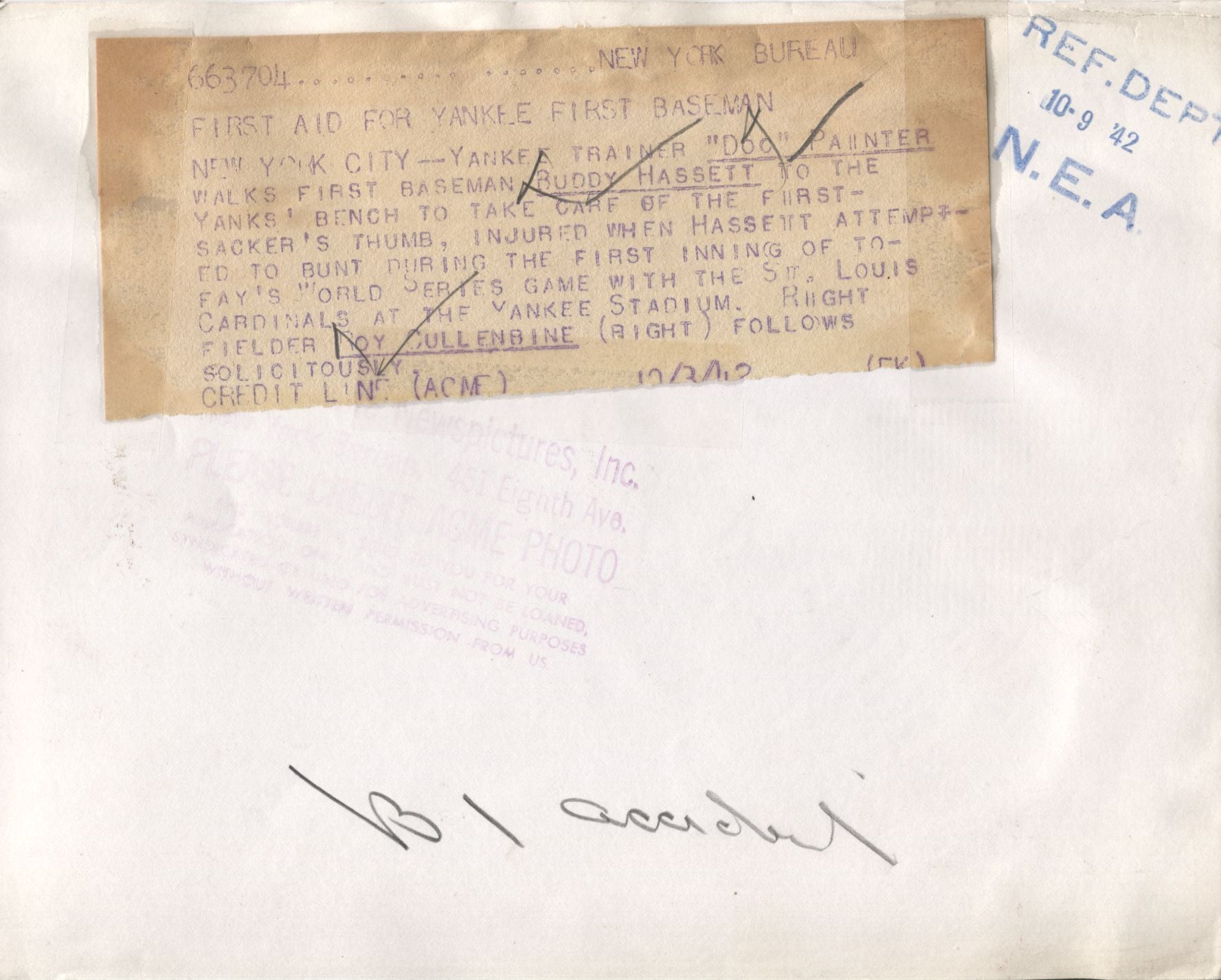 During Game 3 of the World Series, Yankee first baseman Buddy Hassett is tended to by trainer "Doc" Painter after injuring his thumb during a bunt attempt. Right Fielder Roy Cullenbine watches with interest. The Cardinals won the series in 5 games.This is an original 9 x 7 photo. Attached ACME caption on reverse dated 10/3/1942 in addition to original ACME stamp. Also on the back is a reference date stamp: 10/9/1942.