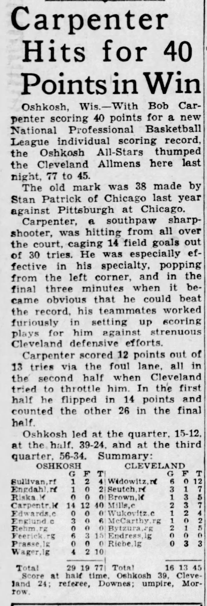 1946 Oshkosh All Stars vs Cleveland Allmen Transfers Scorecard Program - Bob Carpenter Sets Single Game Scoring Record