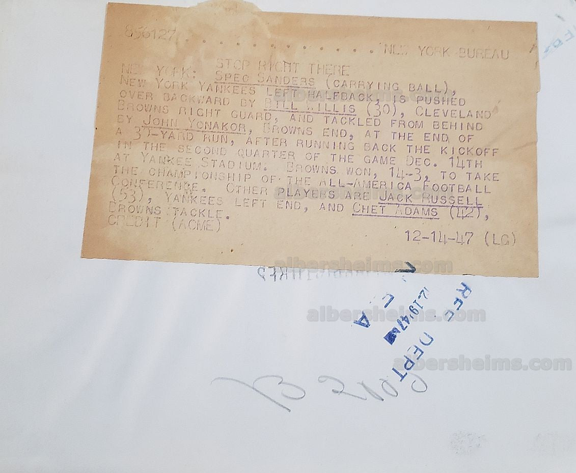 Offered is an original TYPE 1 photo measuring 7" x 9" in size from ACME news service.This crystal-clear photo has the original paper caption attached to the back dated 12-14-1947 from a game in New York when the 2ndyear AAFC teams, Cleveland Browns played the Yankees in a game played at Yankee Stadium.Future Pro Football Hall of Famer and first African American to sign with an AAFC team, Bill Willis knocks over Yankees, halfback, Spec Sanders.Also seen in the photo is John Yonakor and Chet Adams of the Browns, as well as Jack Russell of the Yankees.The Browns won 14-3.Historic early photo with great clarity and historic shot of this African American pioneer.