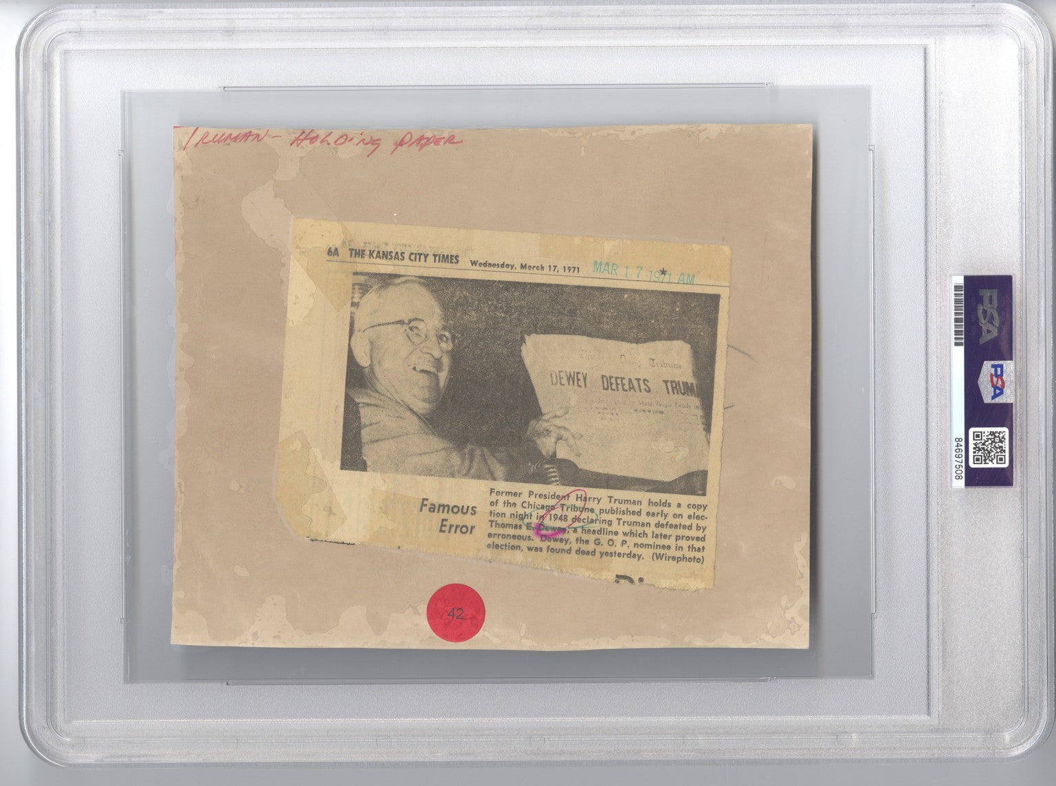 1948 Dewey Defeats Truman Press Photo of Harry Truman holding up the Chicago Daily Tribune PSA/DNA