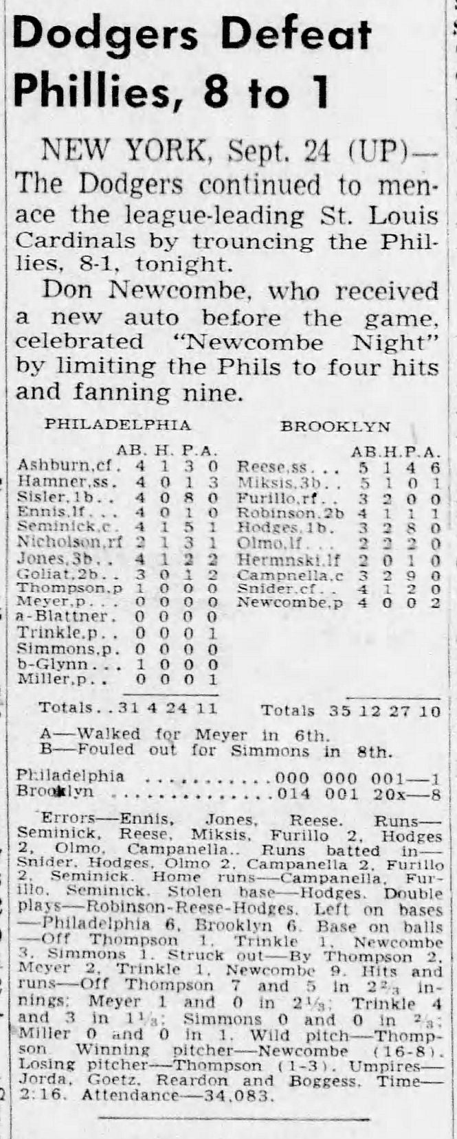 1949 Brooklyn Dodgers vs Phillies 9/24 Ticket Stub - Don Newcombe Win #16 Jackie Robinson Hit Roy Campanella HR #31 Furillo HR #32 PSA 6