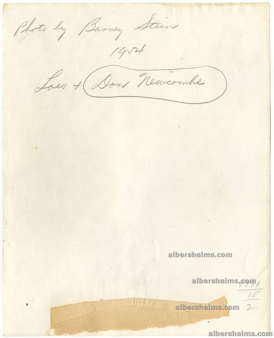 Offered is a crystal clear 8" x 10" shot of Brooklyn Dodgers pitching stars, Don Newcombe and Billy Loes holding a baseball with the #54 written on it.Both adorn their Brooklyn baseball caps.Loes is in street clothes and Newcombe is interestingly enough pictured in a Dodgers jersey that was worn by Phillip Haugstad in 1951.Taken by legendary Brooklyn Dodgers and Sports Illustrated photographer, Barney Stein.We presume this must have been taken during spring training and Barney asked Don to grab a jersey.Caption on back and signature in pencil in the hand of Barney Stein.Interesting shot!