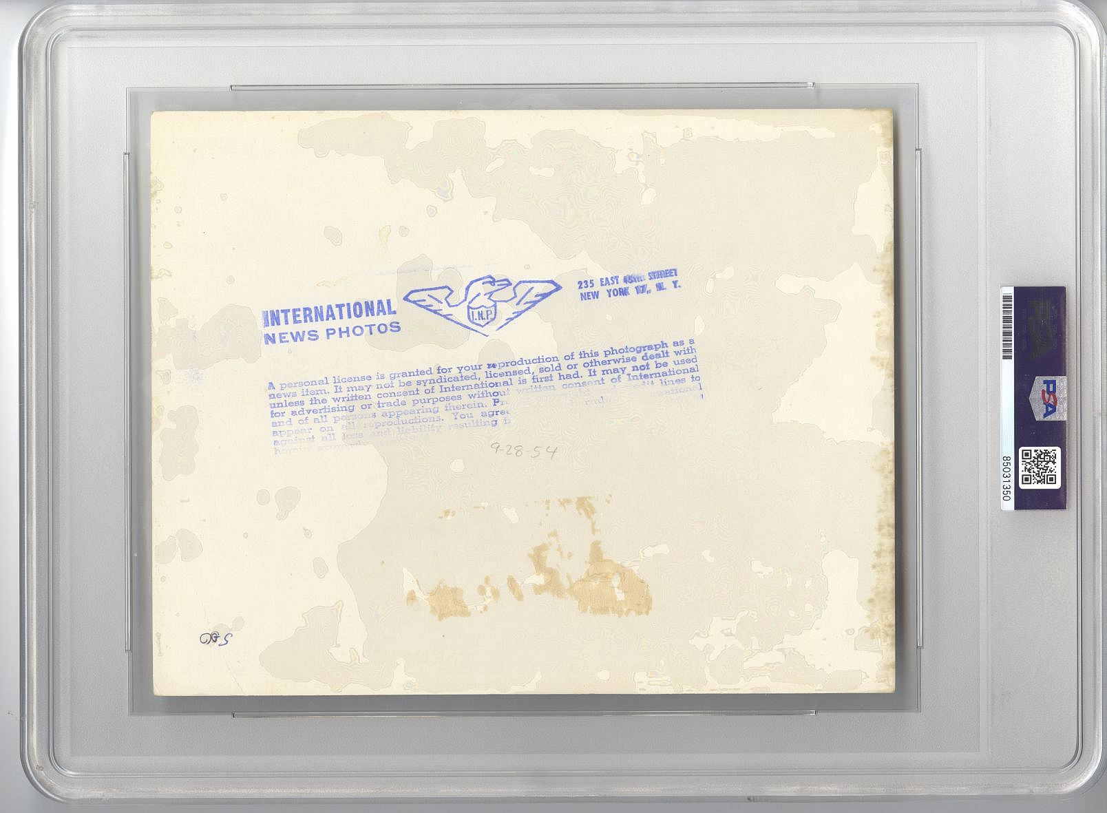 Offered is this original 7x9 TYPE I International News photo (stamped on back) of8 members of the 1954 National League champion New York Giants, are ready to open the World Series at the Polo Grounds. Starting team consists of (l. to r.) Whitey Lockman, Davey Williams, Hank Thompson, Alvin Dark, Don Mueller, Willie Mays, Monte Irvin and Wes Westrum.Crystal Clear shot!!!Encapsulated Authentic as a TYPE 1 photo by PSA/DNA and Full detailed LOA from PSA/DNA