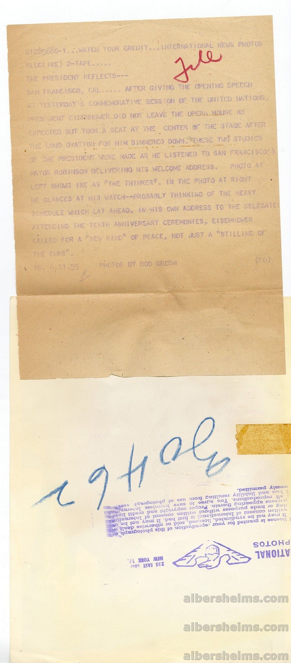 1955 Spectacular 7 x 9 Original TYPE 1 photograph of President Dwight D. Eisenhower as he reflects after giving a speech to the United Nations. Taken by photographer Bob Grosh and issued by the International News and with a paper caption on the back, this is the only example we have ever seen.