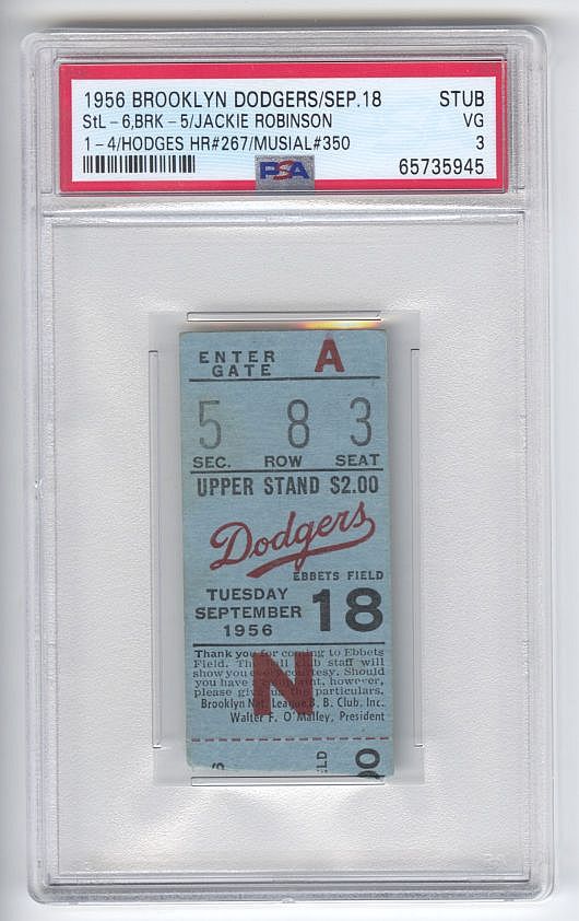 On 9/18/1956 the Cardinals would beat the Brooklyn Dodgers at Ebbets Field in front of a crowd of 13,784 fans.Larry Jackson (2-2) would take the win and Carl Erskine would be on the losing end (13-10)Notably, Jackie Robinson had a 2 run 2 out single, breaking a string of 20 consecutive scoreless innings for Cards pitcher, Vinegar Bend Mizell.Future Hall of Famers - Gil Hodges hit career Home Run #267 and Stan Musial hit career HOME RUN #350 (he had hit a total of 475 bombers when he retired)Encapsulated by PSA (PSA 3)To date, this is a POP 1 in the PSA report.