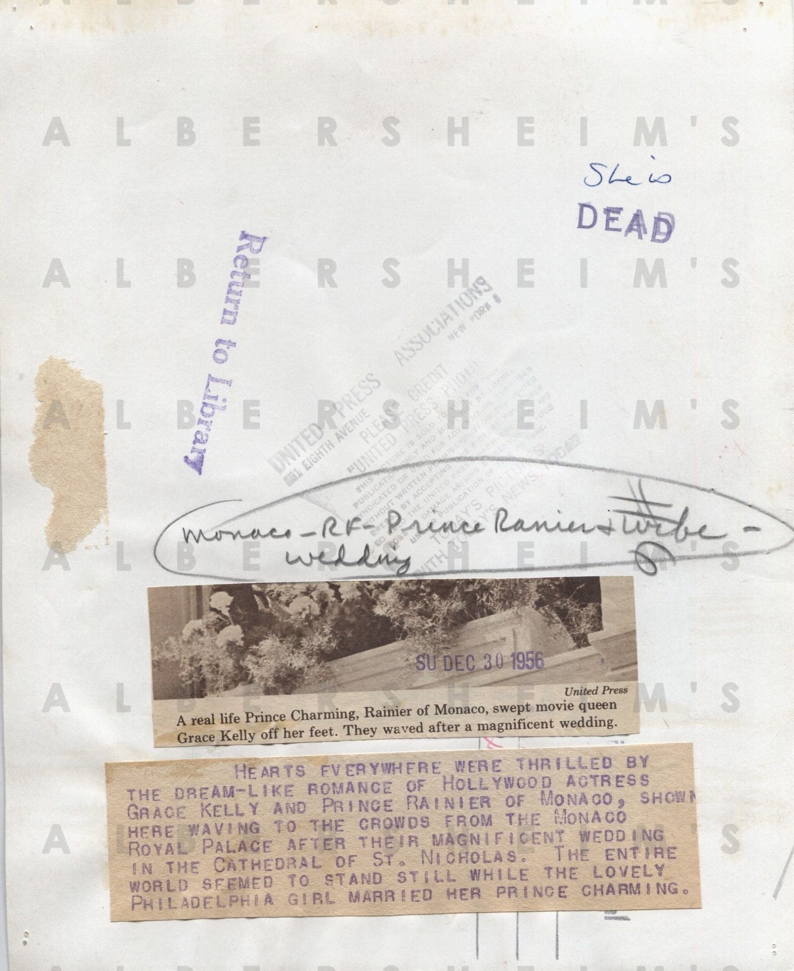 1956 original photograph of Prince Rainier and his bride, actress Grace Kelly, as they wave to their crowds of fans after their wedding. An important moment in entertainment history, this is the day a Hollywood Princess became a real life Princess!This photo (8" x 10") was issued by the United Press and stamped on the back with a paper caption.