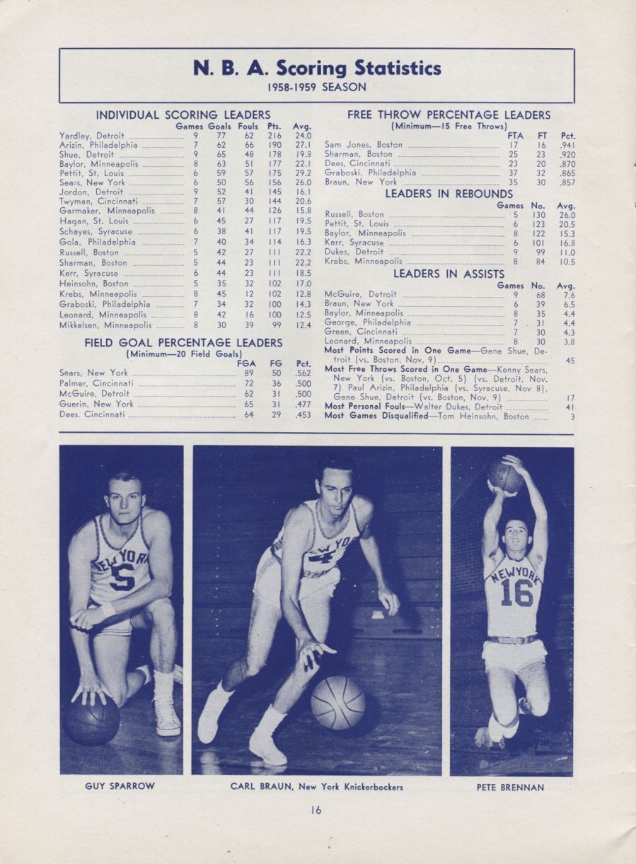 The1958-59 New York Knicks seasonwas the 13thseasonfor the team in theNational Basketball Association(NBA). In theregular season, theKnicksfinished in second place in the Eastern Division with a 40-32 win-loss record, qualifying for theNBA Playoffsfor the first time since the1955-56 season. New York lost in thefirst roundto theSyracuse Nationals, two games to none.The 1958-59 Minneapolis Lakers enjoyed their 11thseason in the NBA and finished up with a 33-39 record for 2ndin the Western Division.They lost in the NBA finals 0-4 to the Boston Celtics.We offer a NY Knicks home program from November 16, 1958.All pages intact, binding tight, no torn out pages.Loaded with photos, stats, articles, unscored.Signed on the cover by Knicks All-Star, Kenny Sears who owns the distinction of being the first basketball player to grace the cover of Sports Illustrated.This came out of a former player's collection.The Knicks beat the Lakers 98-90 at Madison Square Garden.Charlie Tyra led the Knicks with 22 points, Willie Naulls 19, and Carl Braun 15.The Lakers were led by rookie Elgin Baylor with 18 points, Dick Garmaker and Jim Krebs with 15, and Hot Rod Hundley with 11 points.Kenny Sears had 10 points, but had to leave the game when his eye was cut by Elgin Baylor's fingernail.Nice example with a great autograph on the cover from Kenny Sears.NY high school powerhouse, De La Salle played St. Michael's on the undercard.