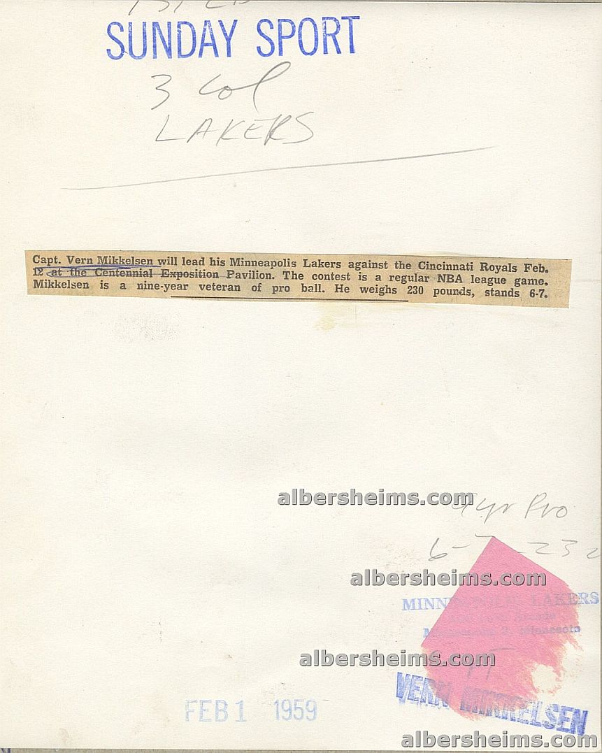 Vern Mikkelsen (1928-2013) was a Hall of Fame forward for the Minneapolis Lakers, known as one of the NBA's first true power forwards. A rugged defender and strong rebounder, he played his entire career (1949-59) with the Lakers, earning six All-Star selections and four NBA championships alongside George Mikan. Mikkelsen averaged 14.4 points and 9.4 rebounds per game over 699 contests, helping define the role of the modern forward with his physical play and durability. Inducted into the Naismith Memorial Basketball Hall of Fame in 1995, he remains a cornerstone of the Lakers' early dynasty.Offered is a 6" x 7.5" original TYPE I photo stamped on the back by the Minneapolis Lakers and stamp dated February 1, 1959 during the Lakers last season in Minneapolis before moving to L.A.Minneapolis Lakers team issued photos (let alone a TYPE I) are highly sought after.