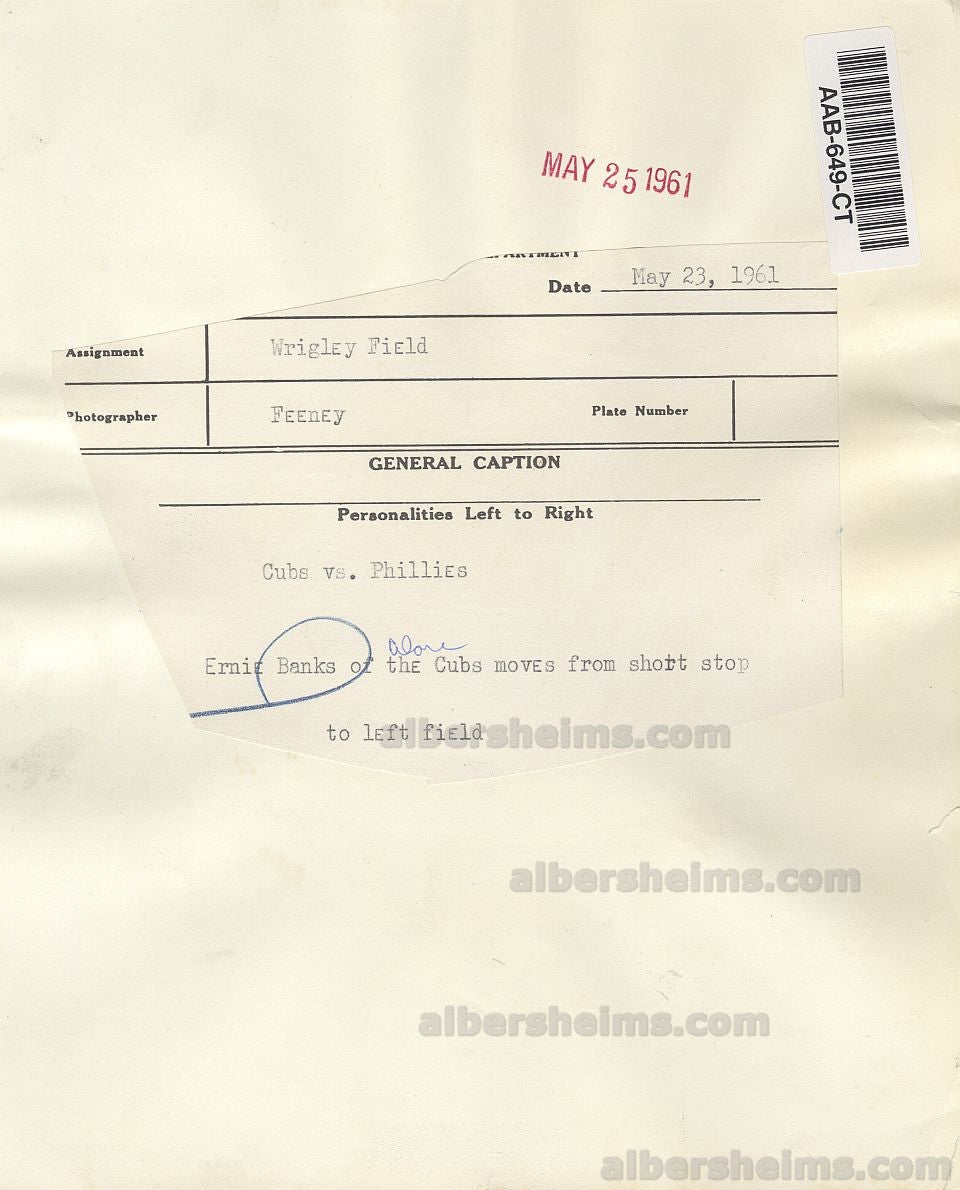 Let me tell you about a fella named Ernie Banks, who was no ordinary ballplayer, no sir. You see, Ernie took to that shortstop position for the Chicago Cubs like a cat takes to cream. And when I say he shined, I mean he lit up the whole town. This guy? He was making plays like nobody's business, and the way he swung that bat? Well, it'd make even a statue want to get up and cheer. They still talk about that '55 season when he whacked 44 home runs, and let me tell you, back in those days, shortstops weren't exactly known for swinging like Babe Ruth.By the time '59 rolled around, Banks had two MVPs to his name, and he wasn't even done. Now, you gotta understand something: the Cubs were struggling a bit back then, but as Jimmy Dykes once said, "Without Ernie, the Cubs might as well be playing in Albuquerque." So yeah, he was that kind of guy.But by 1960, the brass were starting to think, "Hey, maybe we oughta figure out how to keep this fella around a little longer." You know, preserve the goods, so to speak. Ernie, turning 30 and all, wasn't exactly a spring chicken anymore, even if he still played like one. So on May 23, 1961, they shuffled him out to left field for the first time. Yeah, that's right, ol' Ernie in the outfield. Strange sight, maybe, but Ernie could handle it. Heck, the man could've played blindfolded and still been better than half the league.That season, he bounced between left, shortstop, and first base, knocking out 29 dingers and driving in 80 runs like it was nothing. But for the first time since anyone could remember, the MVP voters didn't give him so much as a wink. Was it the position shuffle? Maybe. But Ernie, well, he took it in stride.Come 1962, they moved him to first base for good, and that's where he stayed. Never set foot at short again, not in a game, anyhow. But no matter where he stood on the field, he was always Mr. Cub, and that's the gospel truth.Offered is an original TYPE I photograph of Ernie Banks against the backdrop of Wrigley Field's Ivy covered wall that measures 8x10 inches in size.Original paper caption on the back from this historic game vs the Phillies. Taken by Chicago Tribune photographer, Edward Feeney.Classic shot of the most popular Cub in Chicago History!