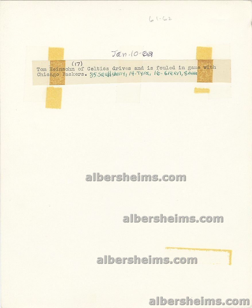 On January 10, 1962 The Boston Celtics would play the Chicago Packers (one year NBA team) at the International Amphitheatre, with the struggling Packers (9-29 at that point) beating the Boston Celtics (who were now 32-7) 103-90.Offered is an original TYPE I photo measuring 8"x10" in size featuring #7 Tom Heinsohn (HOF) driving to the hoop and is instantaneously fouled.Also picture in this spectacular action shot are #35 Woody Sauldsberry, #14 Charlie Tyra, #15 Sihugo Green, and #8 Walt Bellamy (rookie year - future HOFer) of the Chicago Packers ganging up on this future Hall of Famer.Gorgeous 1 of 1 photograph featuring a one-year team (Chicago Packers photos are seldom seen).