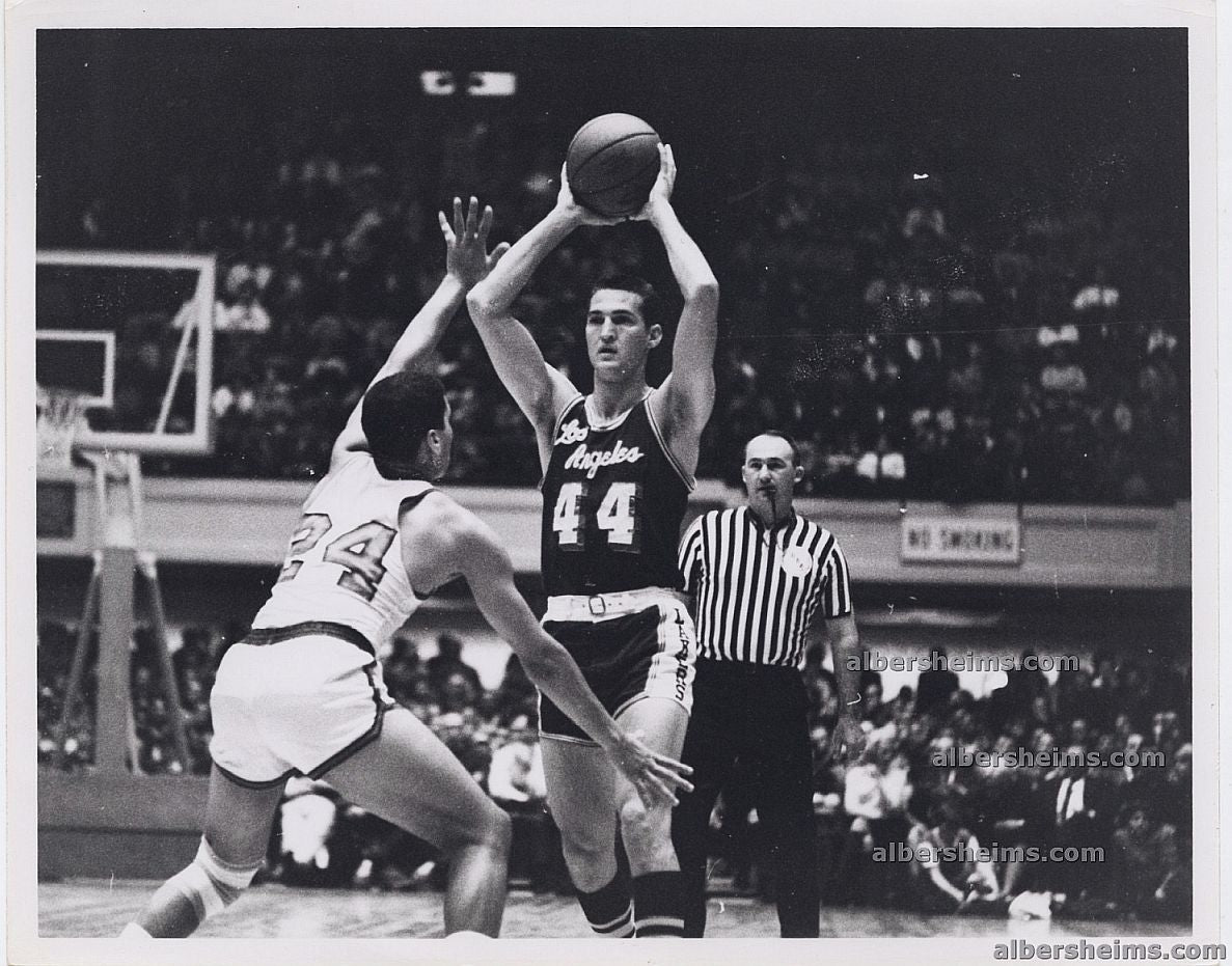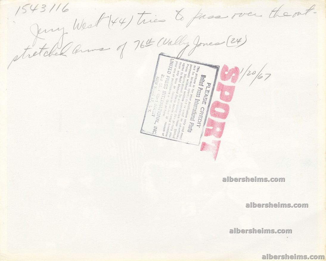 This brilliant photo was taken on January 20, 1967 in a game played at the Philadelphia Convention Center.This original horizontal 8" x 10" photo shows Jerry West attempting to pass over the head of the 76ers Wali Jones. West had 22 pts/10 trb that night in this losing effort (119 Sixers - 108).Original SPORT Magazine stamp on back along with the UPI stamp.Handwritten caption noted on the verso as well.Brilliant shot!