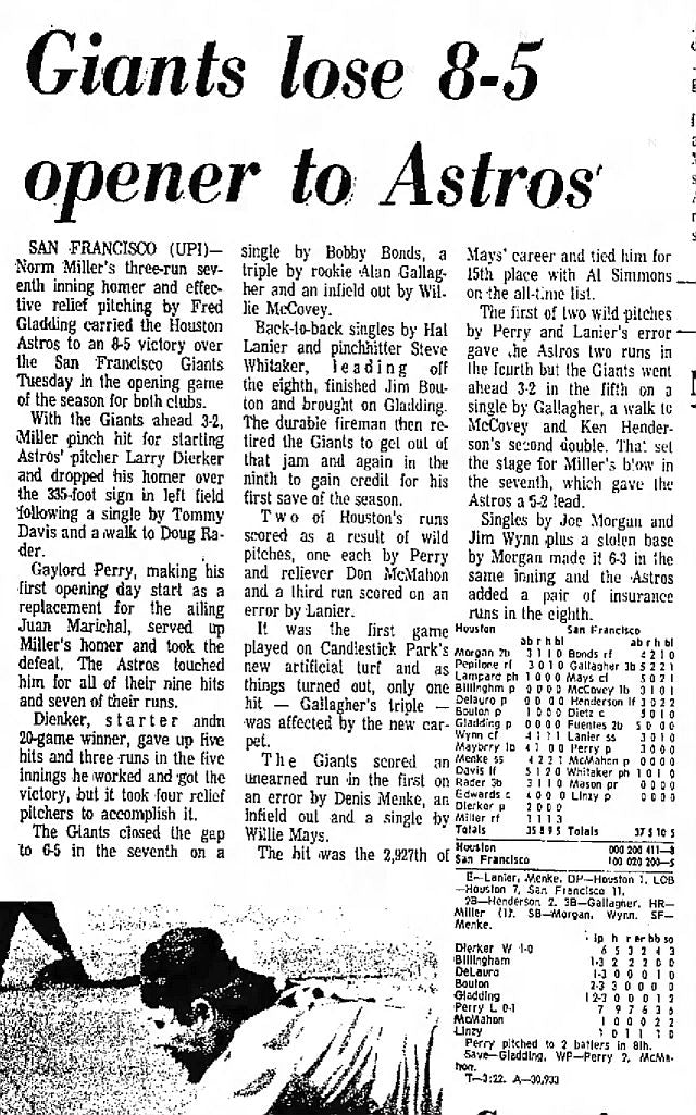 On April 7, 1970 the Houston Astros defeated the San Francisco Giants 8-5 in the 1973 season opener at Candlestick Park on the new artificial turf. Norm Miller homered for Houston. Gaylord Perry started for the Giants, while Fred Gladding earned the save for the Astros in their victory.Willie Mays hit his 2927thsingle of his career which tied him for 15thplace with Hall of Famer, Al Simmons on the All-Time List in a game played in front of 30,933 fans.Offered is a ticket stub from this game in EX plus condition (with a notable rust stain from the ticket being attached to a program at some point).