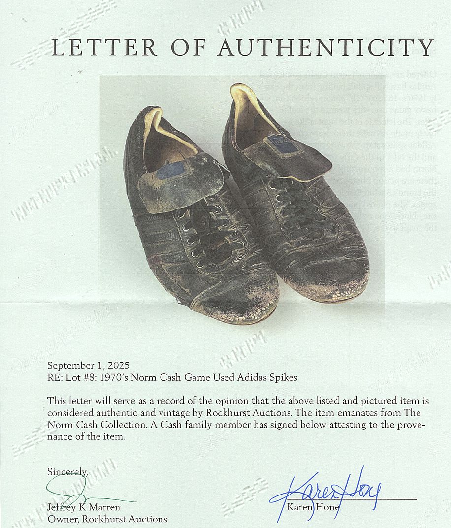 Norm Cash spent 15 of his 17 seasons with the Detroit Tigers. He was part of the 1968 World Series Champion Detroit Tigers, a five-time All Star, and the 1961 batting champion who hit.361 finishing more than thirty points ahead of the number two batter. At the time of his retirement, Norm's 377 career home runs were the fourth most by an American League left-handed hitter behind Babe Ruth, Ted Williams and Lou Gehrig--nice list, huh? His 373 home runs with the Tigers is tied for second in franchise history with Miguel Cabrera, behind Al Kaline. An apt description of Norm, from the SABR project, is "a larger than life first baseman from Texas who lived, drank, and played hard, sang country and western in the clubhouse, and could be depended upon in clutch situationsOffered is a pair of Norm Cash's game-used Adidas baseball spikes from the early 1970s. These size "10" spikes show significant game wear, with visible damage to the leather and soles. The left side of the right spike features cuts, likely made for added comfort. Adidas spikes began appearing in both MLB and the NFL during the early '70s, and it's possible Cash had a sponsorship with the brand, as period photos show him with Adidas' three stripes painted on his Wilson-brand spikes. Interestingly, the stripes on these spikes are covered with black shoe polish. Very Good to Excellent conditionNorm Cash Family LOA