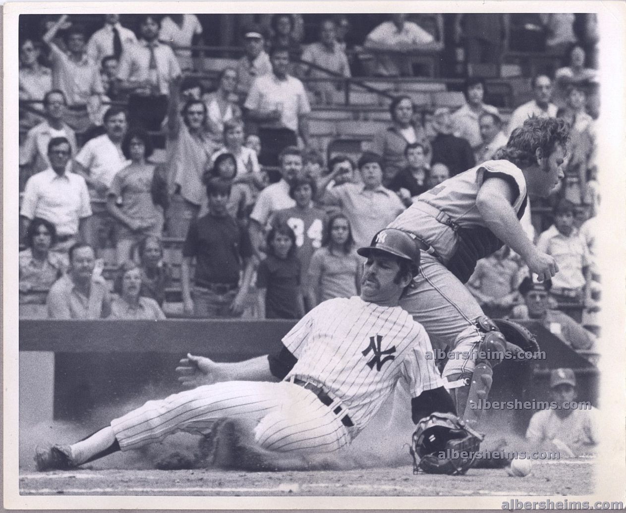 Offered is an original TYPE I photo (measures 8" x 10" in size) 1972 Sweeping horizontal action photograph of young New York Yankees catcher Thurman Munson as he slides home safely with a run. A dramatic image that really shows off his hard-nosed style of play, this is from early in his career and is one of his best action shots we have ever handled.