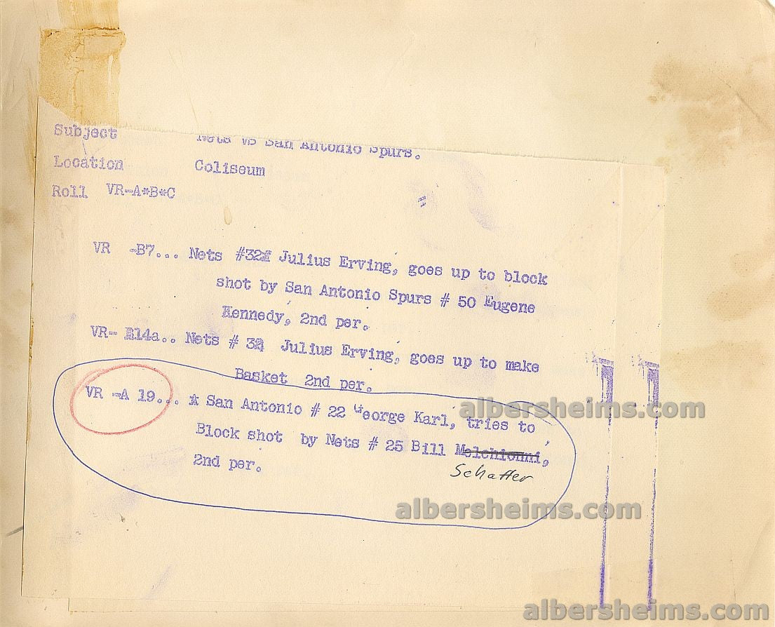 Offered is an original 8x10 inch TYPE I Photo San Antonio Spurs future Naismith Basketball Hall of Famer, George Karl attempting to block a shot against #15 Billy Schaeffer of the New York Nets in a game played at the Nassau Veterans Memorial Coliseum.