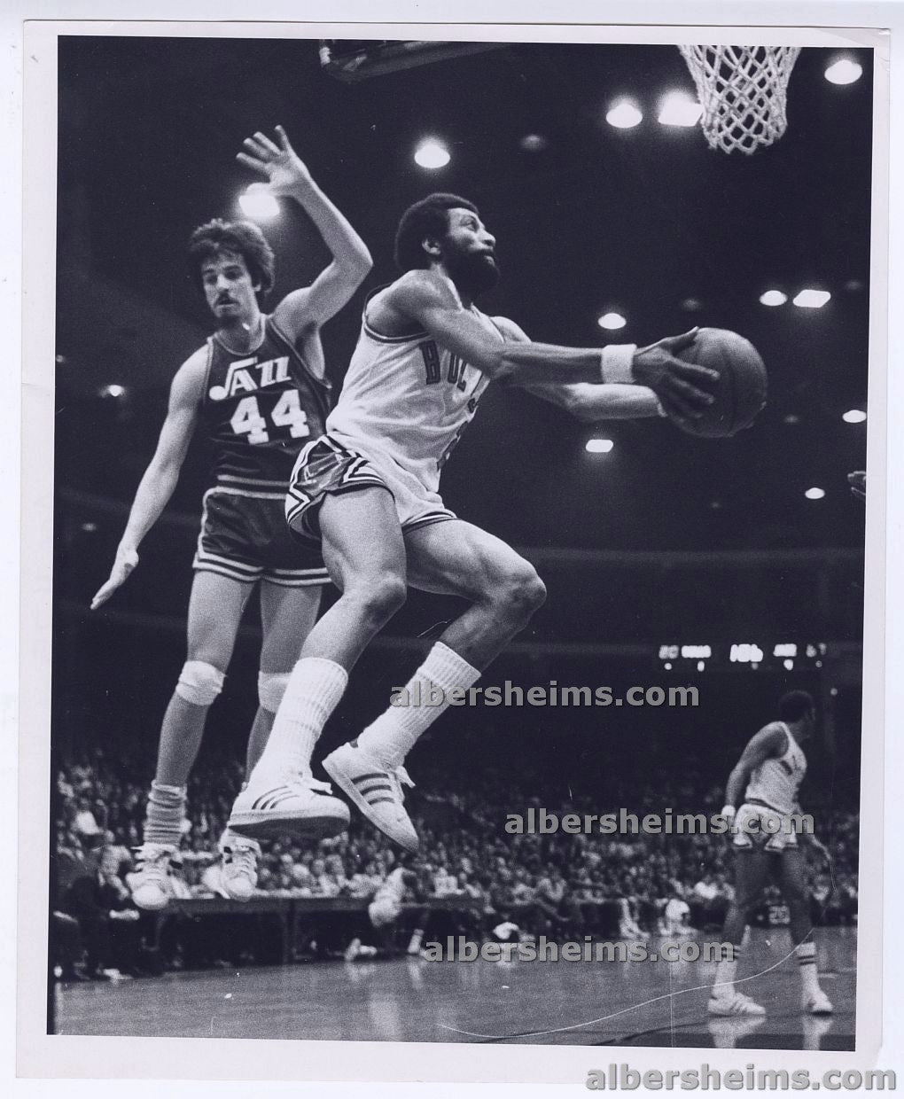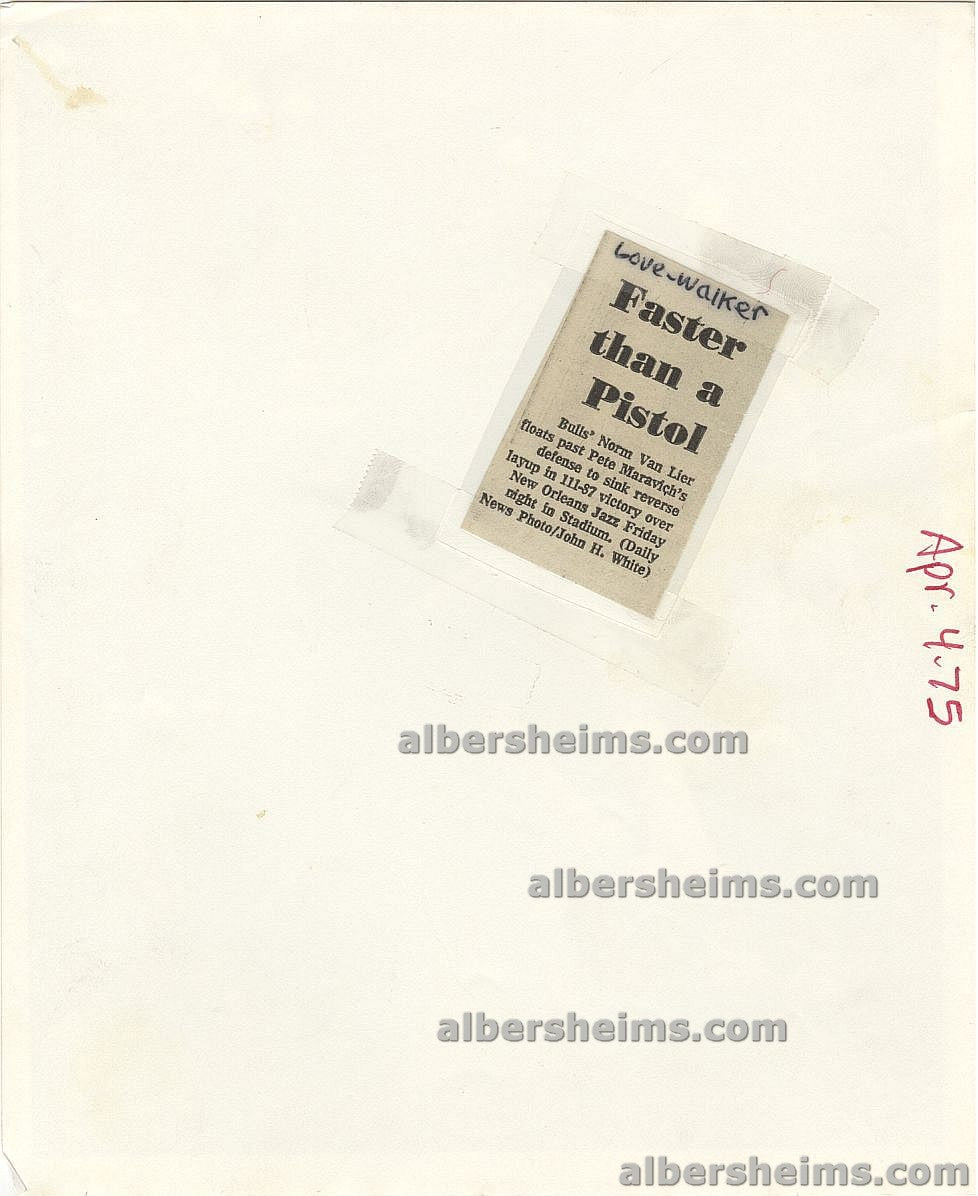 Original Action photo (8" x 10" in size) from April 4, 1975 in a game played in New Orleans wherein a rare occurence, Chicago Bulls star, Norm Van Lier gets the beter of Pistol Pete to sink a reverselayup in the Bulls victory of the New Orleans Jazz 111-87.Crystal clear shot!
