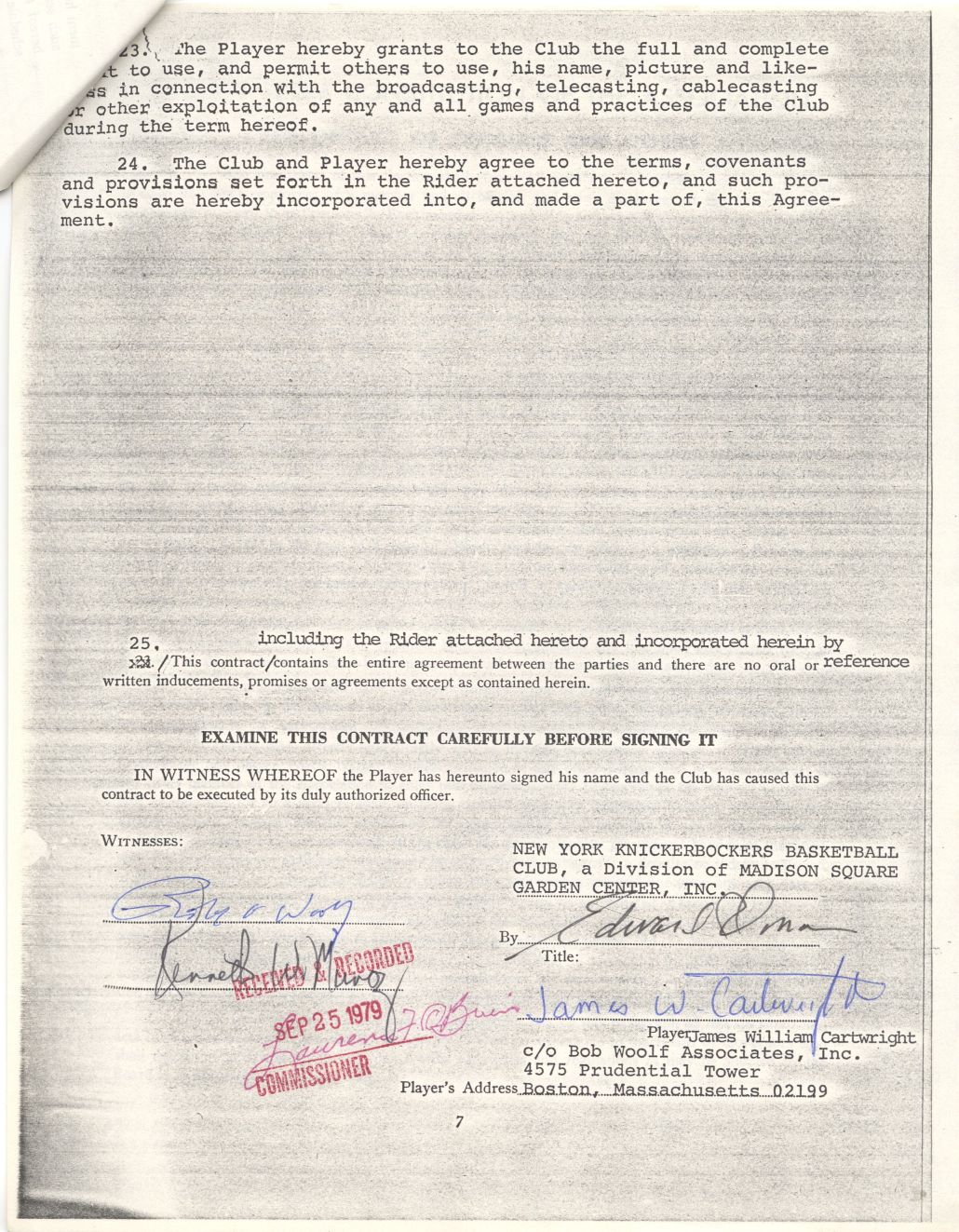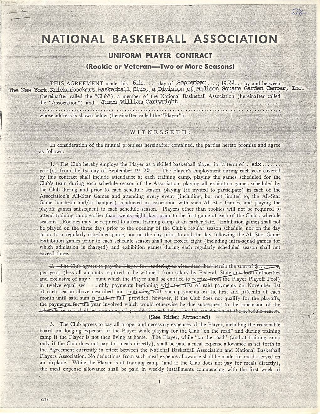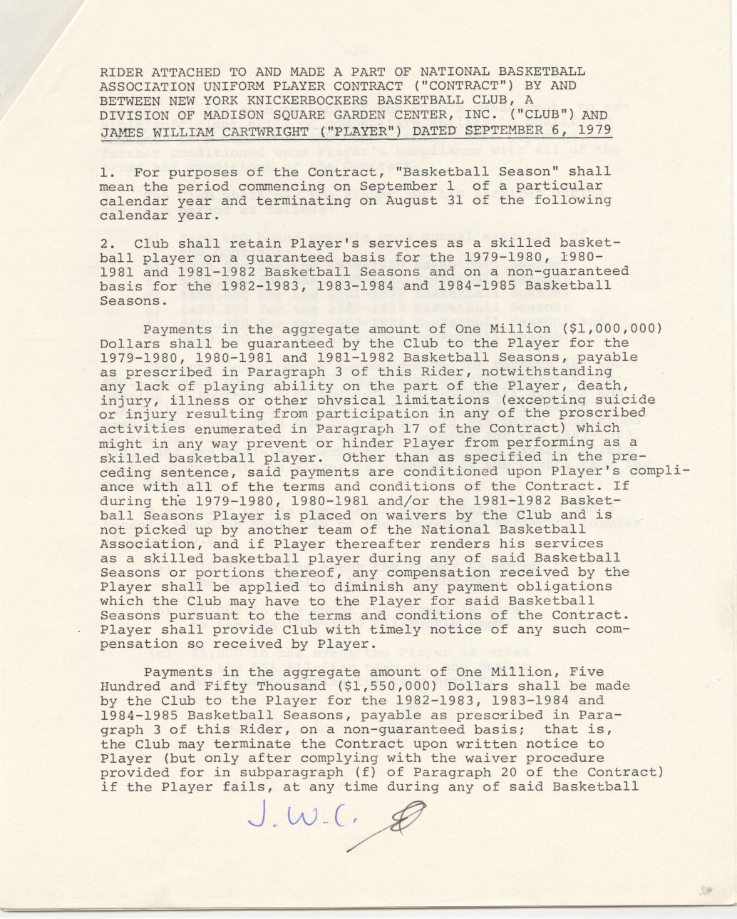 1979-85 Bill Cartwright New York Knicks NBA Basketball Signed AUTO Rookie Contract