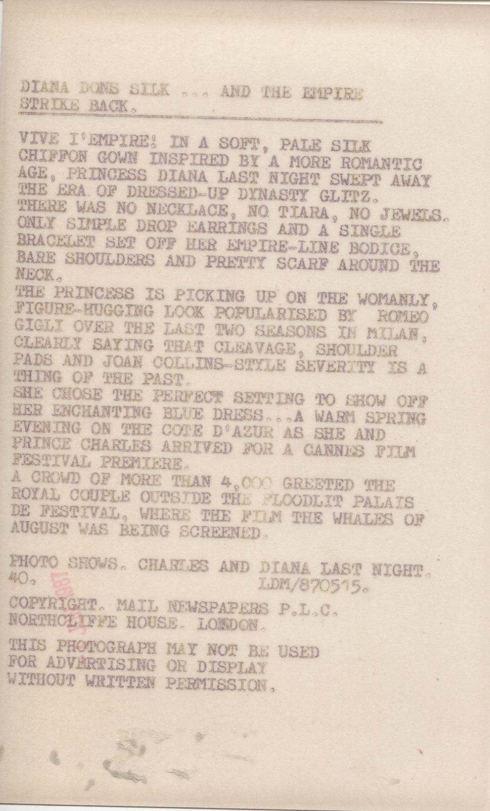 Princess Diana and Prince Charles arrive at the Cannes Film Festival to watch a movie. This 1987 original Mail Newspapers PLC photo (5 x 8 inches) has an extensive typed caption on the back which describes the royal couple's attire in detail and has a date stamp from June 1987.