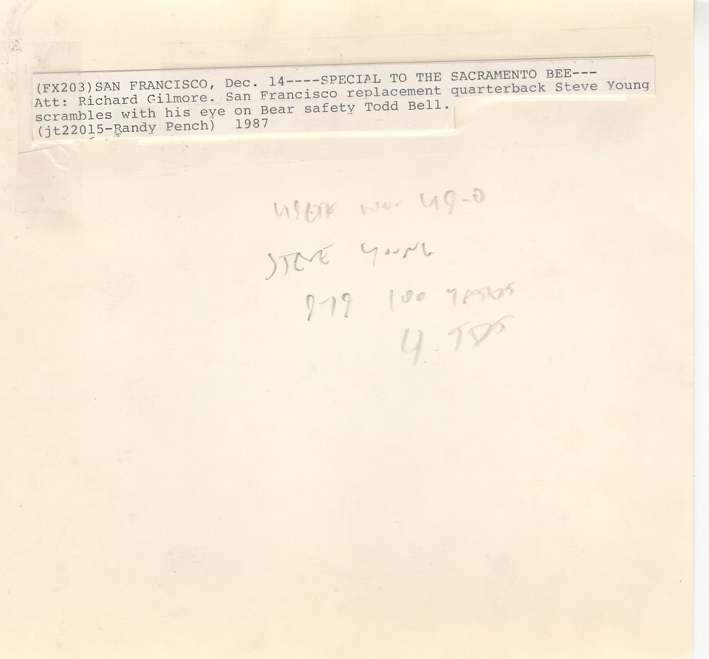 Offered is an original TYPE 1: 1987 Original Poof Photo by THE SACRAMENTO BEE PHOTOGRAPHER RANDY PENCH. Photo measures 8”x 8” in size. Great artistic shot as the clarity is focused on Young, while Bell has been fuzzed out and he tries chasing down the future HOF QB.