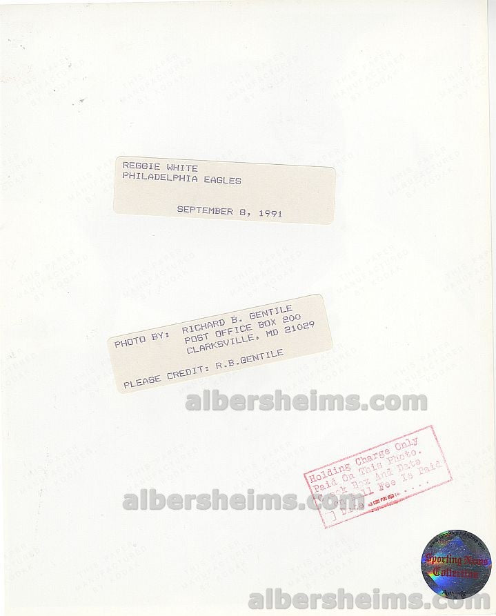 Reggie White (D. 2004) was an American college and professional football player who was mostly a defensive end but also played some defensive tackle in the NFL for 15 seasons during the 1980s and 90s. He played college football for the University of Tennessee, and was recognized as an All-American. After playing two professional seasons for the Memphis Showboats of the United States Football League (USFL), he was selected in the first round of the 1984 Supplemental Draft, and then played for the NFL's Philadelphia Eagles, Green Bay Packers, and Carolina Panthers, becoming one of the most decorated players in NFL history.The two-time NFL Defensive Player of the Year, 13-time Pro Bowl and 12-time All-Pro selection holds second place all-time among career sack leaders with 198.5 (behind Bruce Smith's 200 career sacks). He was selected to the NFL 75th Anniversary All-Time Team, NFL 1990s All-Decade Team, and the NFL 1980s All-Decade Team. During his professional career, he was also known for his Christian ministry as an ordained Evangelical minister, leading to his nickname, "the Minister of Defense." White is a member of the College Football Hall of Fame and the Pro Football Hall of Fame.Offered is an original TYPE I photo that measures 8" x10" in size taken by photographer, Richard B. Gentile.Taken on September 8, 1991(Week 2 of the 1991 season in a game vs the Phoenix Cardinals at Veterans Stadium) on Kodak photograph paper. Derives from the Sporting News Archives.Gorgeous shot of Reggie Smiling on the Sidelines.
