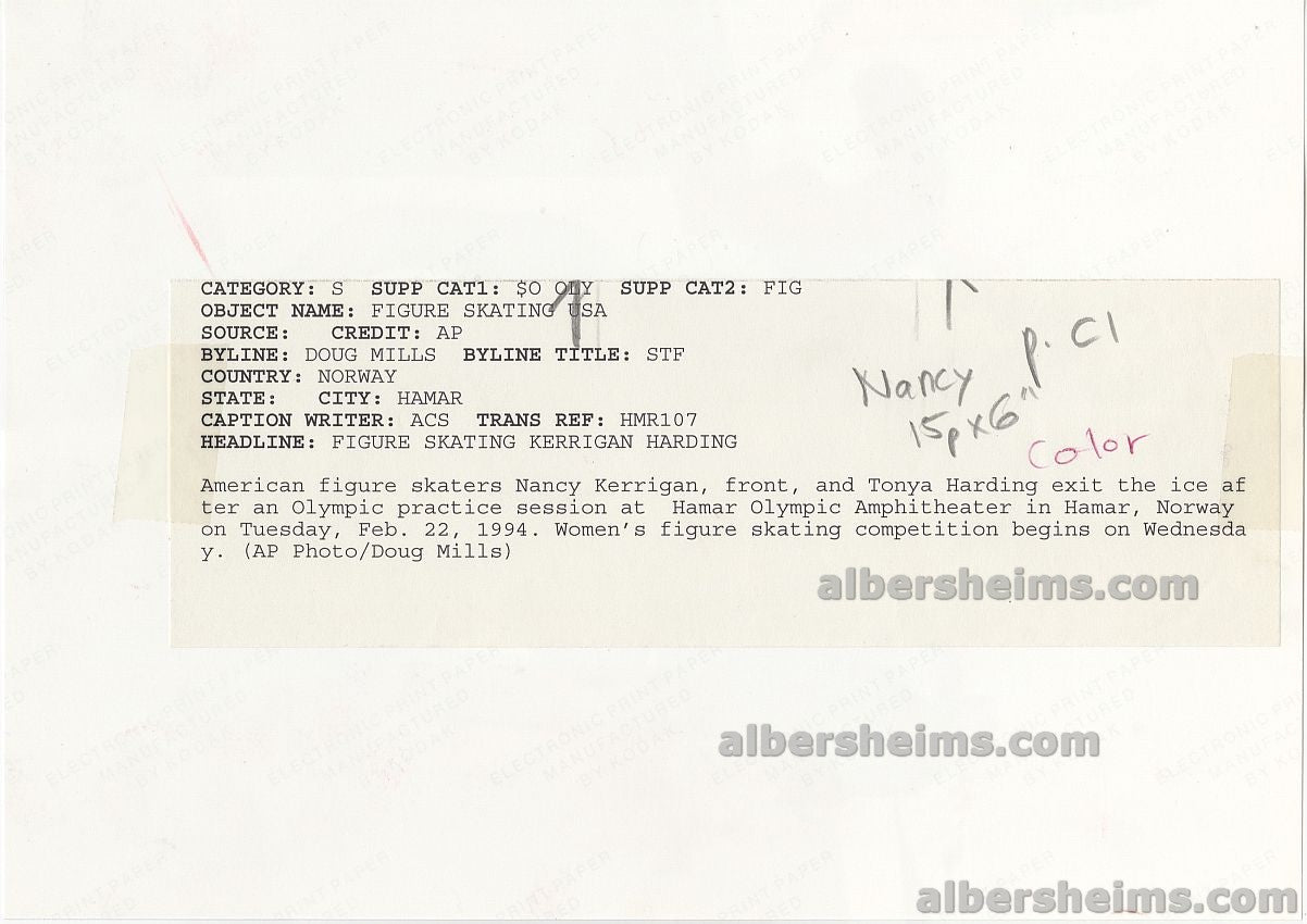 Offered is this original Type I 1994 full color action photograph, measuring 8" x 10", of Tonya Harding and Nancy Kerrigan exiting the ice together in Norway after an Olympic practice session. Just weeks prior, Kerrigan had been attacked by a man affiliated with Harding in a brazen attempt to knock her out of the Olympics. The two were almost never photographed together after that, making this one of the rarest images from one of the most controversial moments in all of sports history. A perfect 10/10 from AP photographer Doug Mills, offered here for the first time ever from a foreign archive. The original AP wire caption is included.