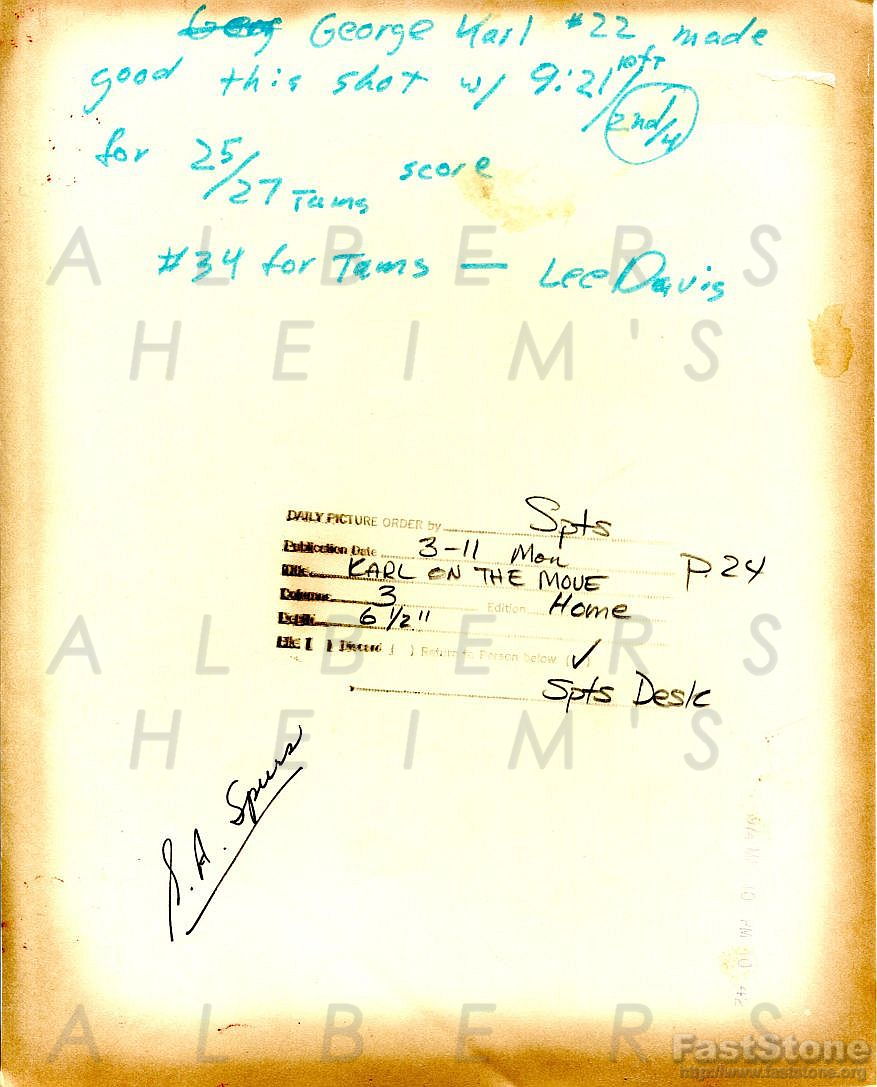 Offered is a photo stamped March 10, 1974.The photo was taken the year before during the 1973-74 season.This 8x10 TYPE I original photo shows George Karl #22 of the San Antonio Spurs being guarded by Memphis Tams star, Lee Davis #34.Rare ABA basketball action shot!