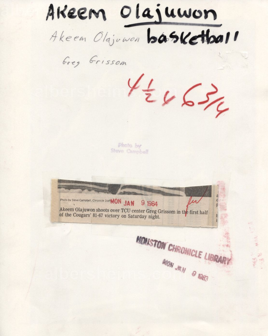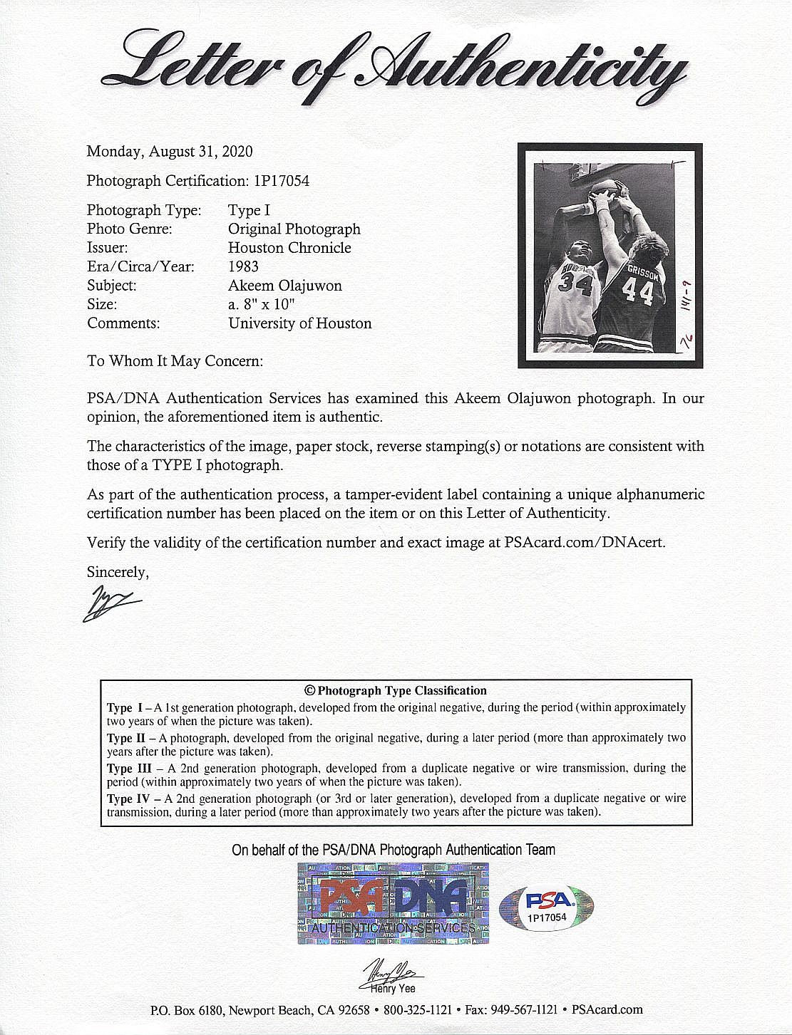 A native of Nigeria, Hakeem Olajuwon came to America armed only with a dream and an extraordinary ability to learn the game of basketball. Blessed with soft hands, great balance, and flawless footwork gained from his days playing soccer and team handball as a boy, "Hakeem the Dream" played the better part of his career in his adopted home of Houston, Texas. He teamed with fellow Hall of Famer Clyde Drexler at the University of Houston where the Phi Slama Jama fraternity reigned supreme in college basketball. Olajuwon led the Cougars to three consecutive Final Four appearances from 1982 to 1984, and was named the Most Outstanding Player in 1983. He led the Houston Rockets to back-to-back NBA championships in 1994 and 1995 and was named Finals MVP both years. Selected to twelve NBA All Star games, Olajuwon holds the NBA record for blocked shots (3,830) and is the only player to record more than 3,000 blocked shots and 2,000 steals in a career. The 1994 NBA regular season Most Valuable Player recorded 26,946 points and 13,748 rebounds during his career.This Steve Campbell (photographer) 8x10 original TYPE 1 photo is dated January 9, 1983 and shows Akeem (as he was known at the time) shooting over TCU center Greg Grissom. Stamped by the Houston Chronicle.Full LOA from PSA/DNA