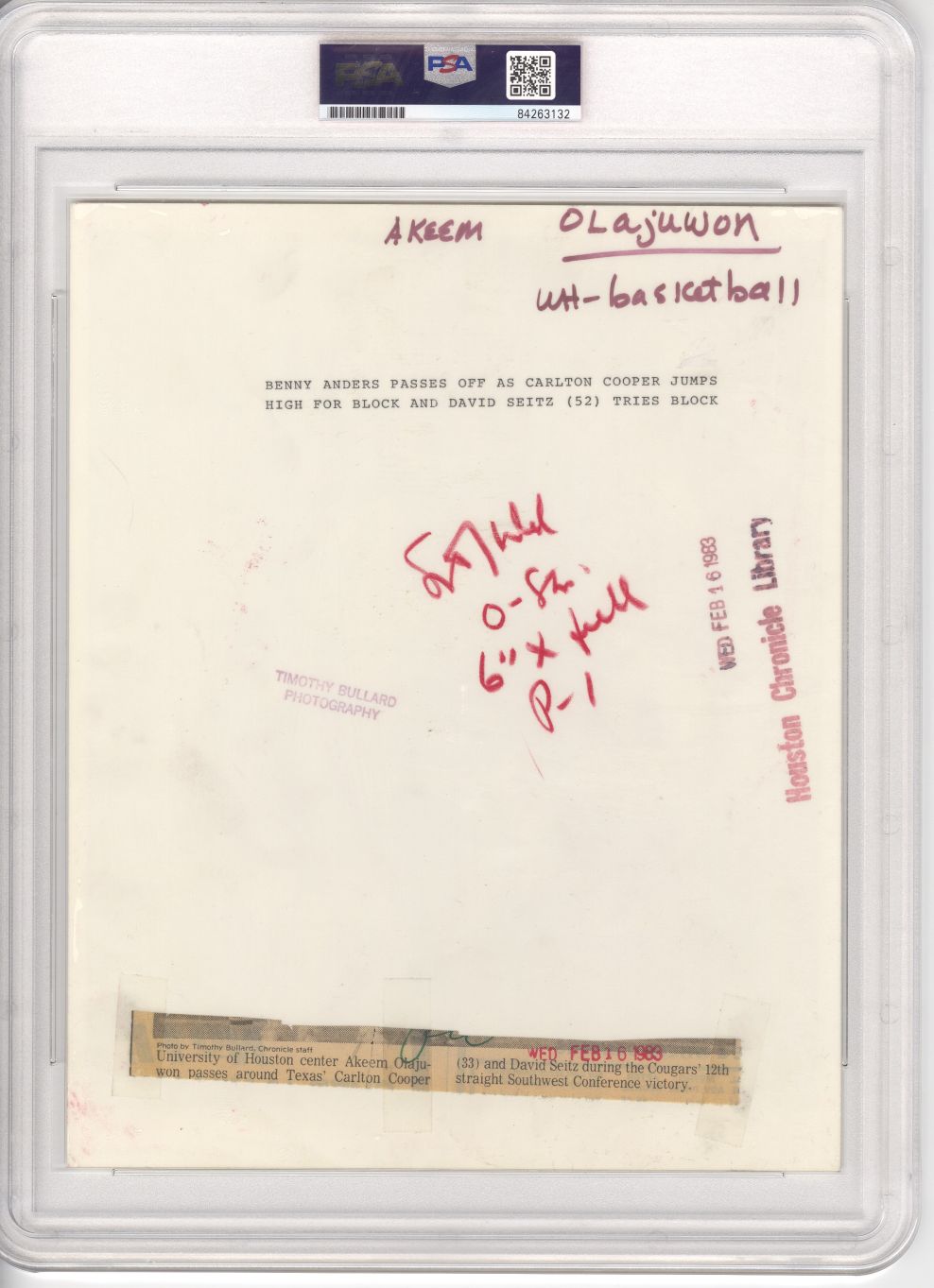 A native of Nigeria, Hakeem Olajuwon came to America armed only with a dream and an extraordinary ability to learn the game of basketball. Blessed with soft hands, great balance, and flawless footwork gained from his days playing soccer and team handball as a boy, "Hakeem the Dream" played the better part of his career in his adopted home of Houston, Texas. He teamed with fellow Hall of Famer Clyde Drexler at the University of Houston where the Phi Slama Jama fraternity reigned supreme in college basketball. Olajuwon led the Cougars to three consecutive Final Four appearances from 1982 to 1984, and was named the Most Outstanding Player in 1983. He led the Houston Rockets to back-to-back NBA championships in 1994 and 1995 and was named Finals MVP both years. Selected to twelve NBA All Star games, Olajuwon holds the NBA record for blocked shots (3,830) and is the only player to record more than 3,000 blocked shots and 2,000 steals in a career. The 1994 NBA regular season Most Valuable Player recorded 26,946 points and 13,748 rebounds during his career.Museum worthy 8x10 photo taken by Timothy Bullard of the Houston Chronicle capturing Akeem taking off to the clouds as he passes around the U of Texas' Carlton Cooper (33) and David Seitz during the Houston Cougars 12thStraight Southwest Conference victory streak in February of 1983.When we view this shot, we just think, "Wooooooooooooooooow!!!!"Photo has been encapsulated by PSA/DNA and comes with a full LOA from PSA/DNA