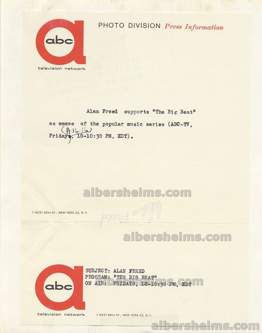 Alan Freed (D. 1965) was an American disc jockey. He also produced and promoted large traveling concerts with various acts, helping to spread the importance of rock and roll music throughout North America.Freed was the first radio disc jockey and concert producer who frequently played and promoted rock and roll; he popularized the phrase "rock and roll" on mainstream radio in the early 1950s. (The term already existed and had been used by Billboard as early as 1946, but it remained obscure.)In 1986, Freed was inducted into the Rock and Roll Hall of Fame. His "role in breaking down racial barriers in U.S. pop culture in the 1950s, by leading white and black kids to listen to the same music, put the radio personality 'at the vanguard' and made him 'a really important figure'", according to the executive director.Freed was honored with a star on the Hollywood Walk of Fame in 1991. The organization's website posted this note: "He became internationally known for promoting African-American rhythm and blues music on the radio in the United States and Europe under the name of rock and roll".In the early 1960s, Freed's career was destroyed by the payola scandal that hit the broadcasting industry, as well as by allegations of taking credit for songs he did not write and by his chronic alcoholism.Offered is an original TYPE 1 photo that measures 7" x9" (approximate size).Freed is standing behind "The Big Beat," bass drum which was the name of his ABC Television show that debuted on May 4, 1957, four months before "American Bandstand," making it the United States' "first nationally-televised rock'n roll dance show.Original paper caption attached to this Historic Photo!