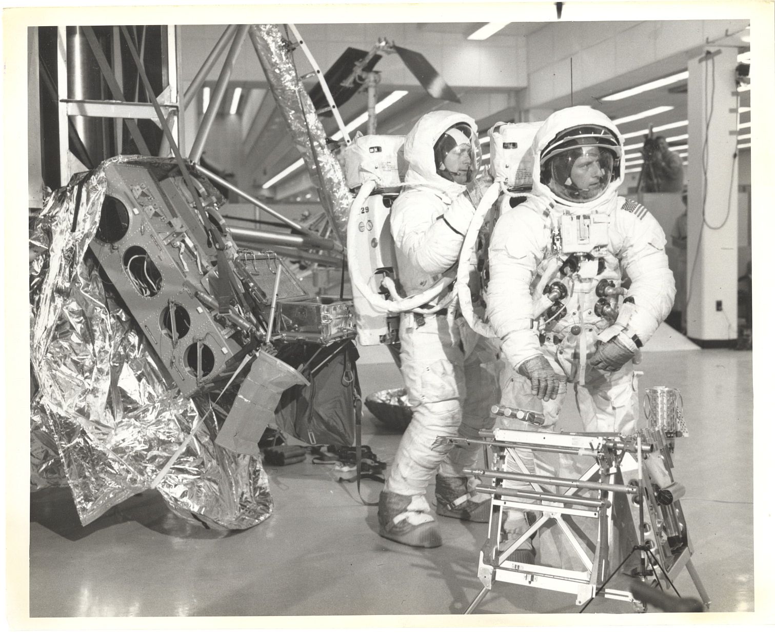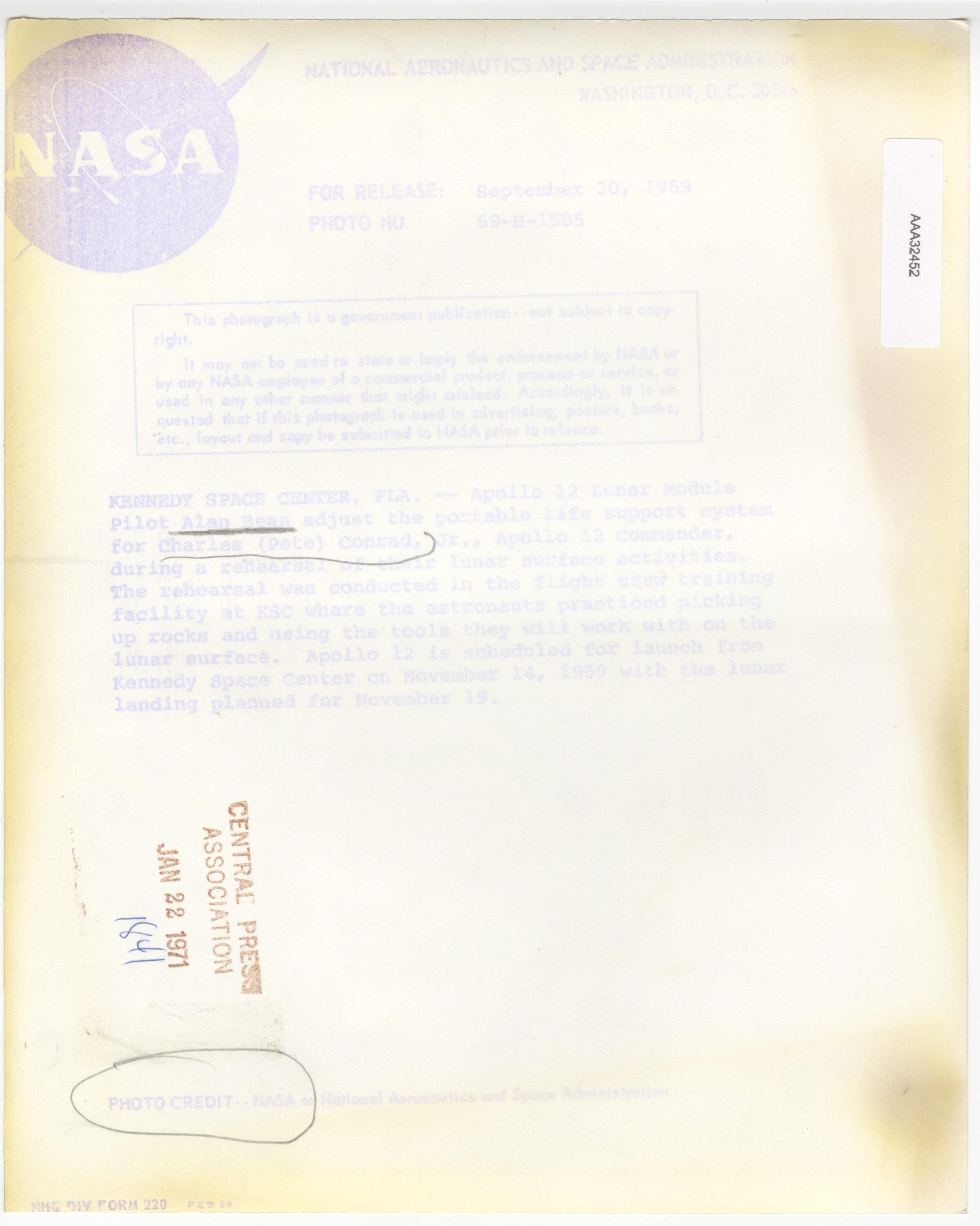 1969 Original TYPE 1 Press Photo by NASA STAFF PHOTOGRAPHER measures 10" x 8" in size.Apollo 12 Lunar Module Pilot Alan Bean adjusts the portable life support system for Charles "Pete" Conrad, Jr., Apollo 12 Commander during a rehearsal of their lunar surface activities. The rehearsal was conducted in the flight crew training facility at KSC where the astronauts practiced picking up rocks and using the tools they will work with on the lunar surface. Apollo 12 is scheduled for launch from Kennedy Space Center on Nov. 14, 1969 with the lunar landing planned for Nov. 19.Apollo 12 was the sixth crewed flight in the United States Apollo program and the second to land on the Moon. It was launched on November 14, 1969, from the Kennedy Space Center, Florida.Historical piece of American Space history!!!