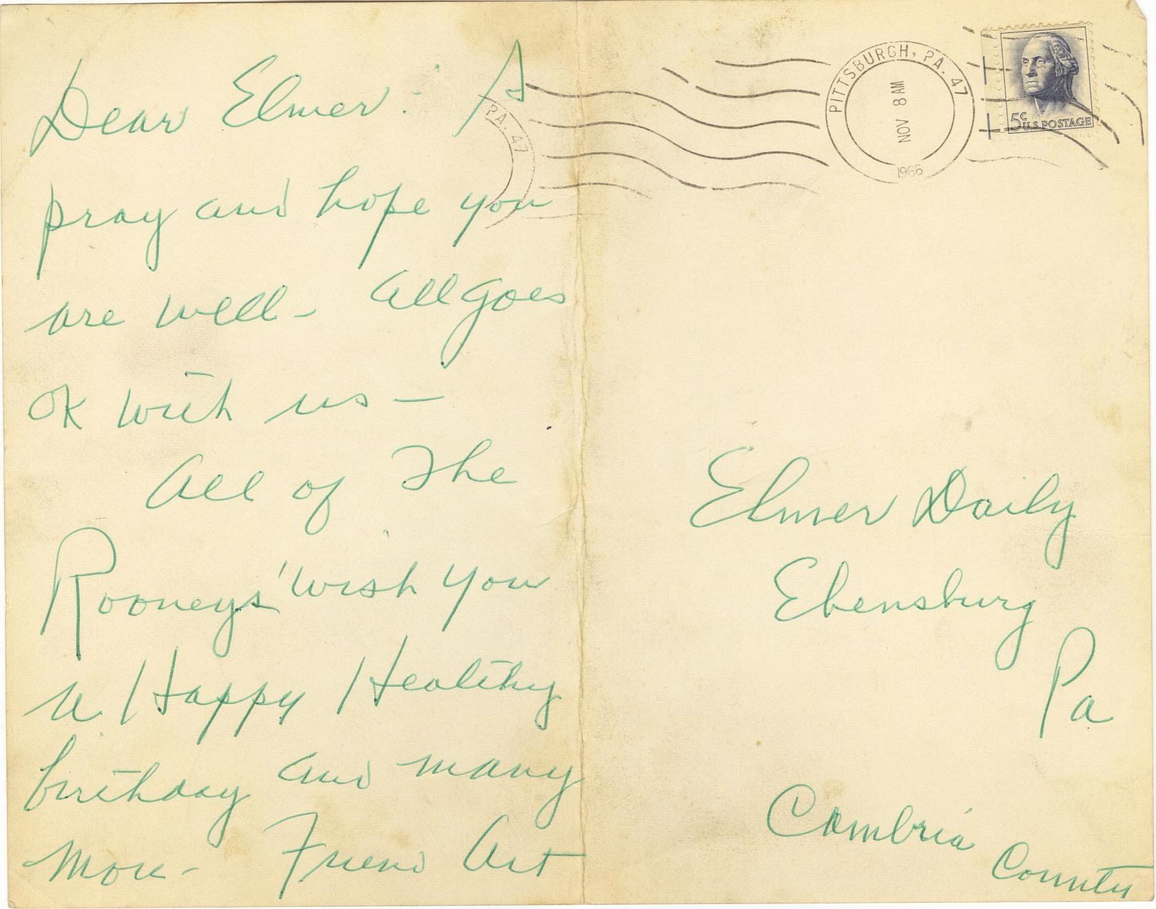 Art Rooney Sr. (D. 1988) often referred to as "the Chief", was the founding owner of the Pittsburgh Steelers, an American football franchise in the National Football League (NFL), from 1933 until his death. Rooney is a member of the Pro Football Hall of Fame, was an Olympic qualifying boxer, and was part or whole owner in several track sport venues and Pittsburgh area pro teams. He was the first president of the Pittsburgh Steelers from 1933 to 1974, and the first chairman of the team from 1933 to 1988.Offered is a 10" x8" Heavy stock postcard/photo from Liberty Bell Park (trotter race track) that has been folded in half and mailed (postmarked November 8, 1966 from Pittsburgh) to Minor League Baseball Executive, Elmer Daily (Mid-Atlantic League President) wishing him a Happy Birthday.Nice vintage piece written and signed completely in Rooney's hand in green ink.