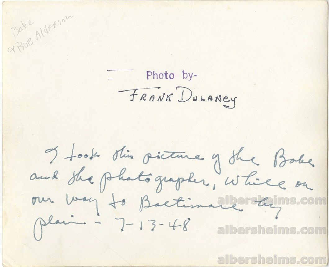 One of the more interesting photos we've encountered of the Babe.This original 8x10 photograph shows Babe Ruth on July 14, 1948 at the end of his life on an airplane (we've never seen another shot of Ruth on a plane, as air travel was still new to non-military folks).This photo shows the Babe posing with photographer, Bob Alderson (see our other Ruth photos) that was taken by Babe Ruth's male nurse, Frank Delaney.Alderson signed and wrote in black steel tipped pen, "Frank - you are some photographer!When you took this we were out over the Atlantic enroute to Baltimore from New York 7-14-48.Regards - Bob Alderson.On the back of the photo, in Dulaney's hand, he captioned the photo.From Frank Dulaney's personal collection. One of a kind!