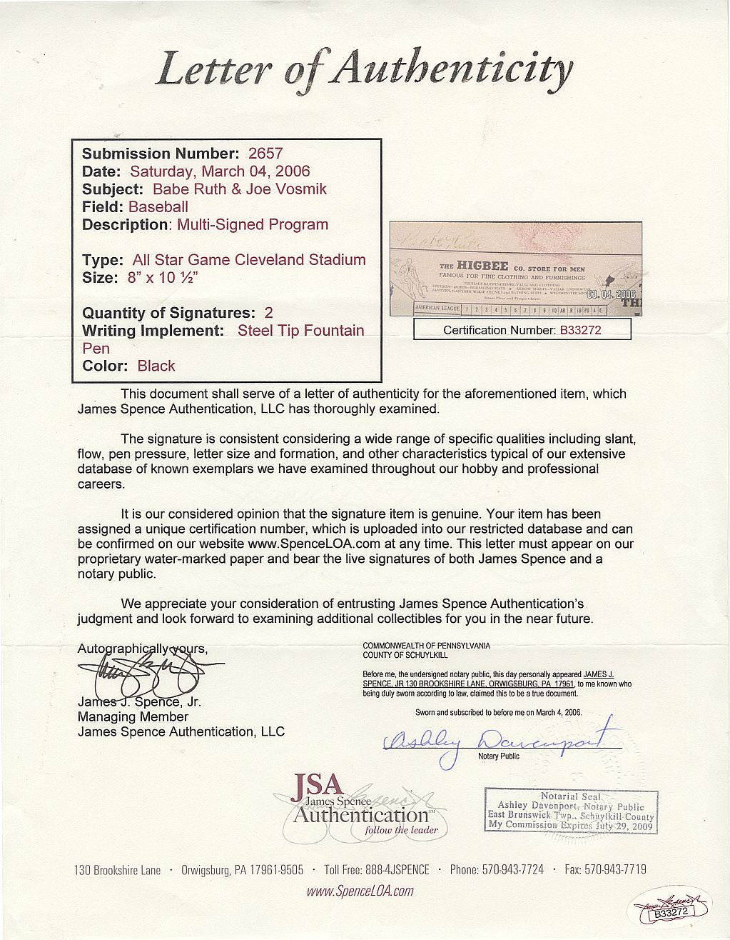 Offered is an original program (scored in pencil) from the 3rd MLB All-Star game in history. It has been signed in black steel tipped pen by both Babe Ruth (who was in attendance at the game) and starting right fielder, Joe Vosmik.