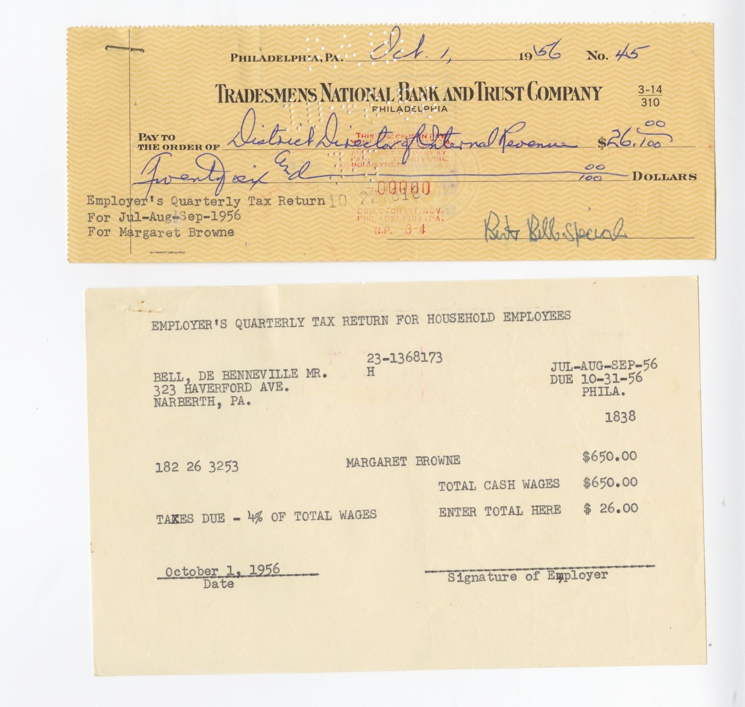 Bert Bell (D. 1959) was the National Football League (NFL) commissioner from 1946 until his death in 1959. As commissioner, he introduced competitive parity into the NFL to improve the league's commercial viability and promote its popularity, and he helped make the NFL the most financially sound sports enterprise and preeminent sports attraction in the United States (US). He was posthumously inducted into the charter class of the Pro Football Hall of Fame.Additionally, he was the owner of the Eagles from 1933-40 and co-owner of the Steelers from 1940-46 prior to becoming the league commissioner.Offered is a signed check made out to the District Director of Internal Revenue dated October 1, 1956.Comes with additional non-signed document showing an accounting of what the check was for. Check has been Signed in steel tipped pen.