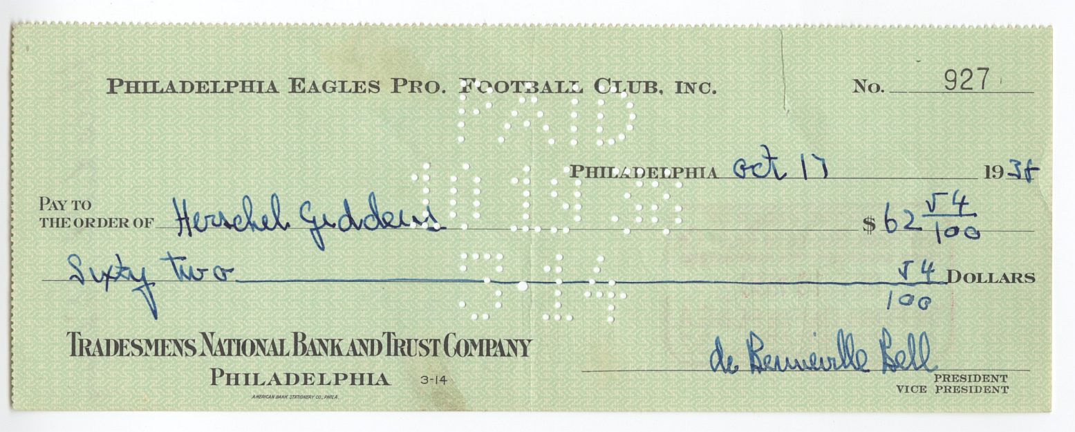 Herschel "Wimpy" Giddens (D. 1959 at age 44) was a tackle out of Louisiana Tech who played in the NFL from 1938 to 1944 for the Eagles and the Boston Yanks.He also played for the Wilmington Clippers in the AFL in those years in between his stints with the Eagles and Yanks in the NFL.We offer a signed Eagles payroll check on the back by Herschel "Wimpy" Giddens and on the front by Pro Football Hall of Famer, Bert Bell (D. 1959).This was his payroll check for the October 16, 1938 game vs the New York Giants.