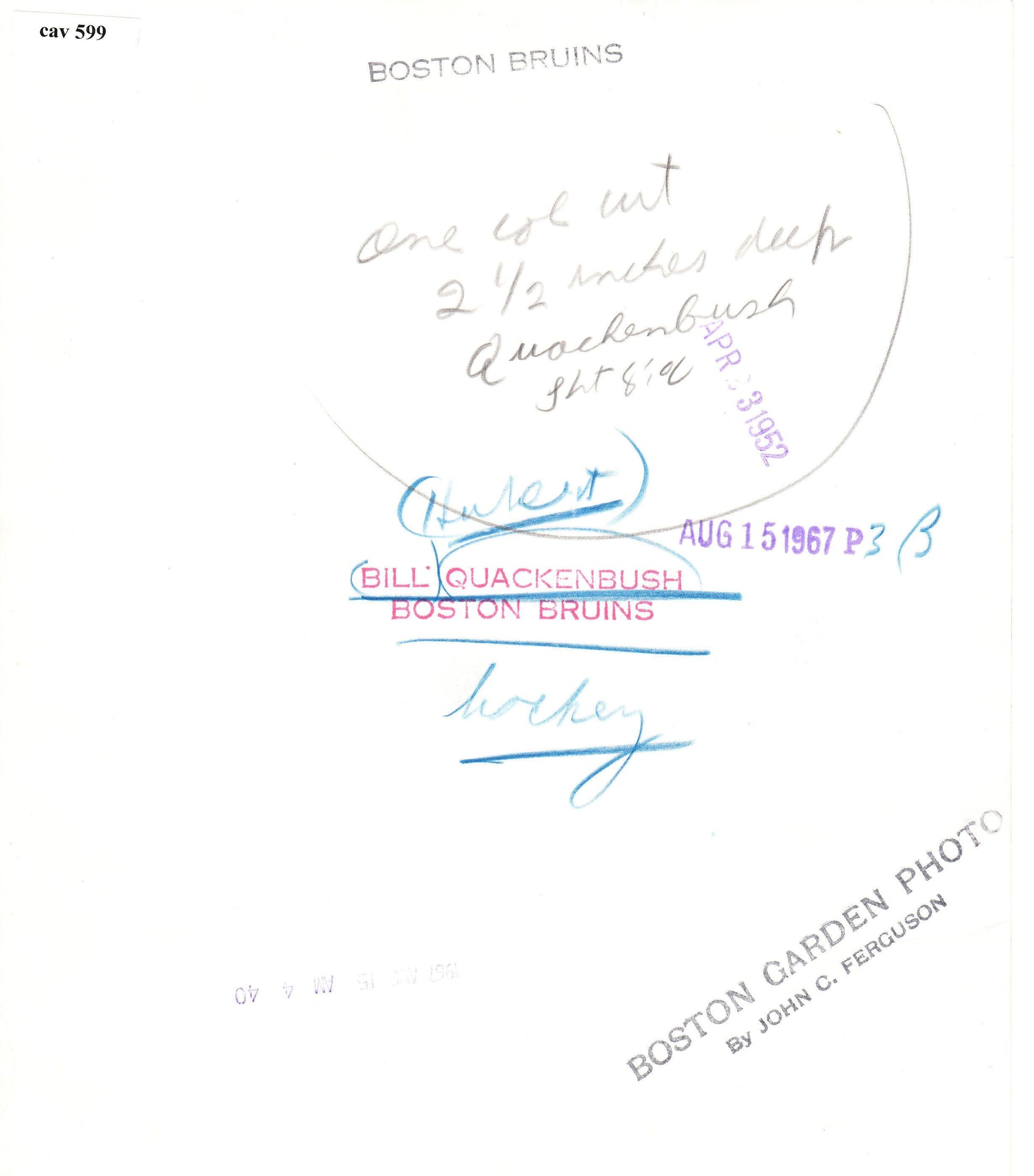 Bill Quackenbush was a Canadian professional ice hockey defenseman who played for the Boston Bruins and Detroit Red Wings in the National Hockey League. During his 14 year career he was the first defenseman to win the Lady Byng Memorial Trophy. He won the award after playing the entire 1948-49 season without recording a penalty. The penalty-less season was part of a total of 131 consecutive games he played without being assessed a penalty. Quackenbush, considered to be an elite offensive defenseman during his career, was named to the NHL All-Star Team 5 times and was inducted into the Hockey Hall of Fame in 1976. We offer an original 8x10 photo issued by the Boston Bruins taken by John Ferguson (stamped on back) dated first in 1952 and then again in 1967. Killer shot!