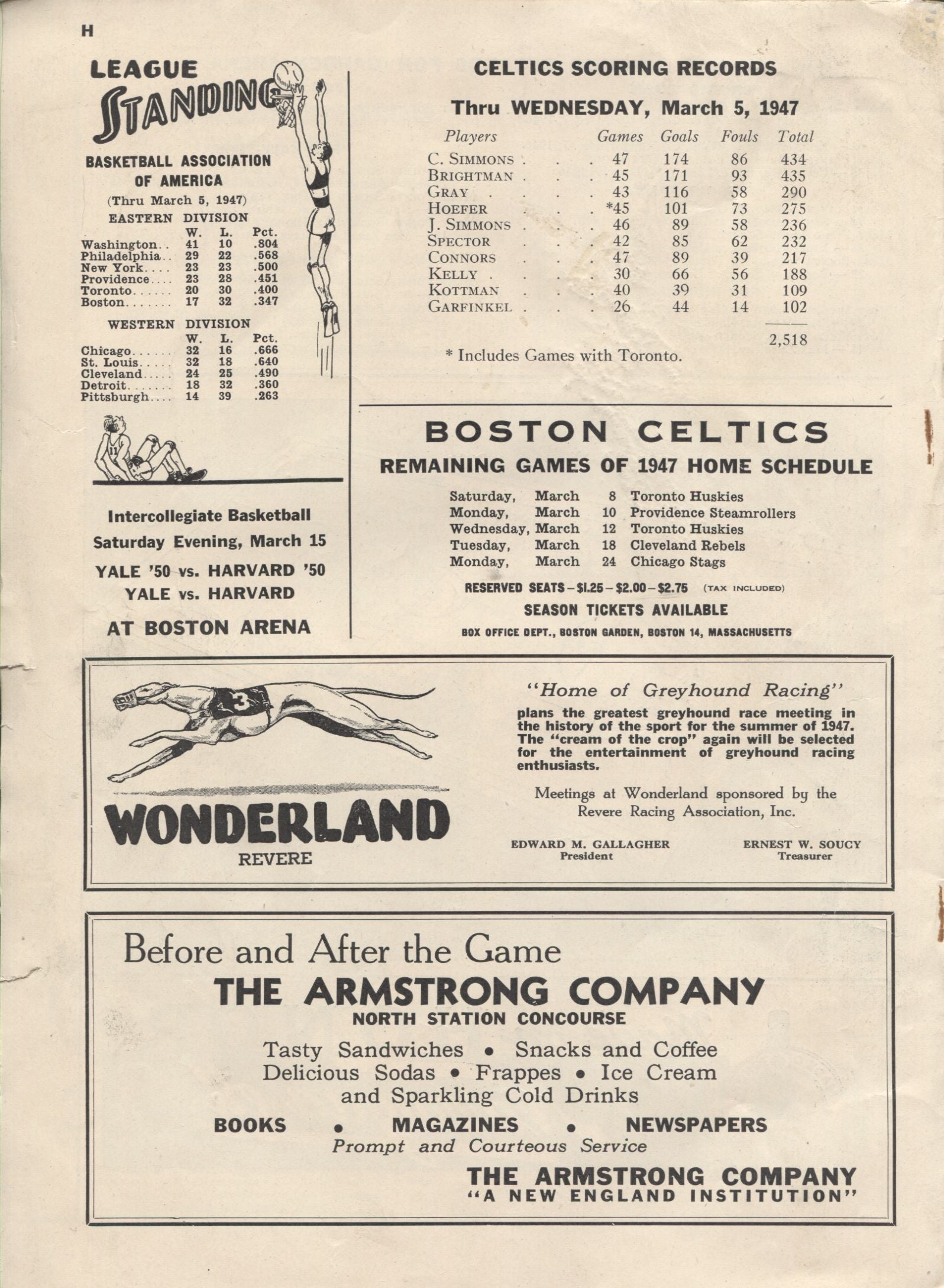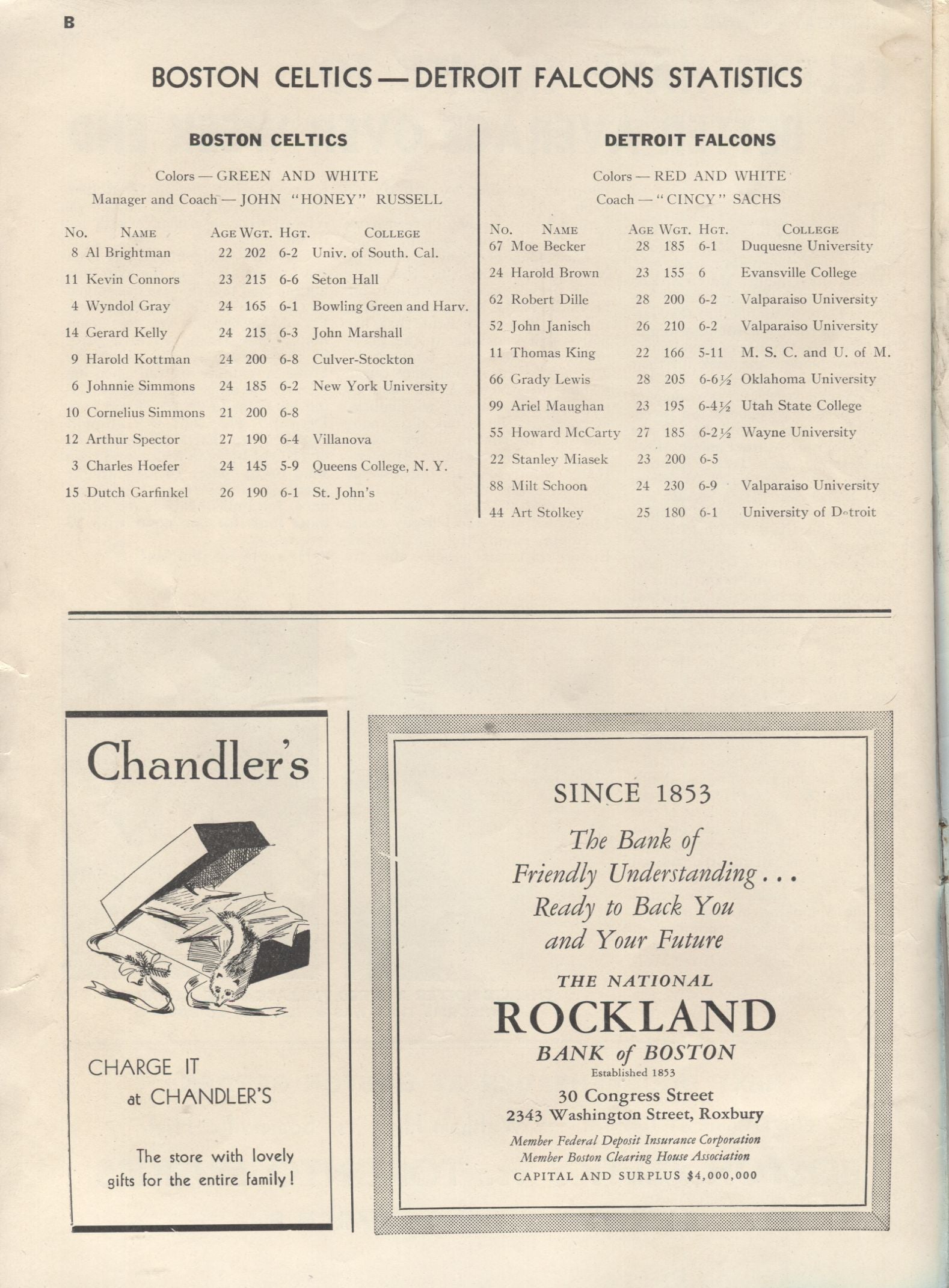 Boston Celtics vs. Detroit Falcons First 1st Year NBA basketball program March 6, 1947