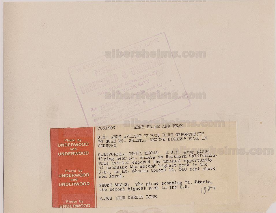 1927 Vintage Press Photo by UNDERWOOD AND UNDERWOOD.United States Army Plane flying near Mt. Shasta in Northern California. This aviator enjoyed the unusual opportunity of scanning the second highest peak in the United States as Mount Shasta towers 14, 380 feet above sea level.Photo measures 10.25" x 8" inches with original Underwood & Underwood stamp on the back and original paper caption.Breathtaking artistic photo!!!Simply stated, this is ART!!