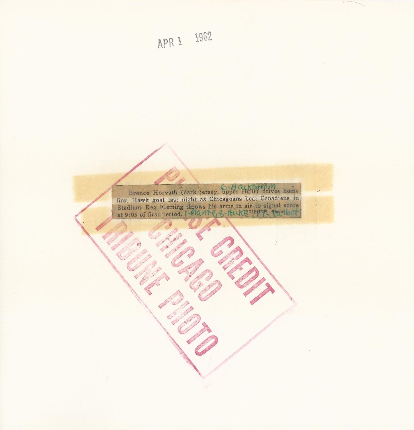 Original 8x8 Chicago Tribune (stamped on back) photo with original newspaper caption. Dated April 1, 1962. Red Fleming signals the score by Bronco Horvath (Hawks). Jacques Plante is distinctly seen kneeling down in the goal. Great shot!